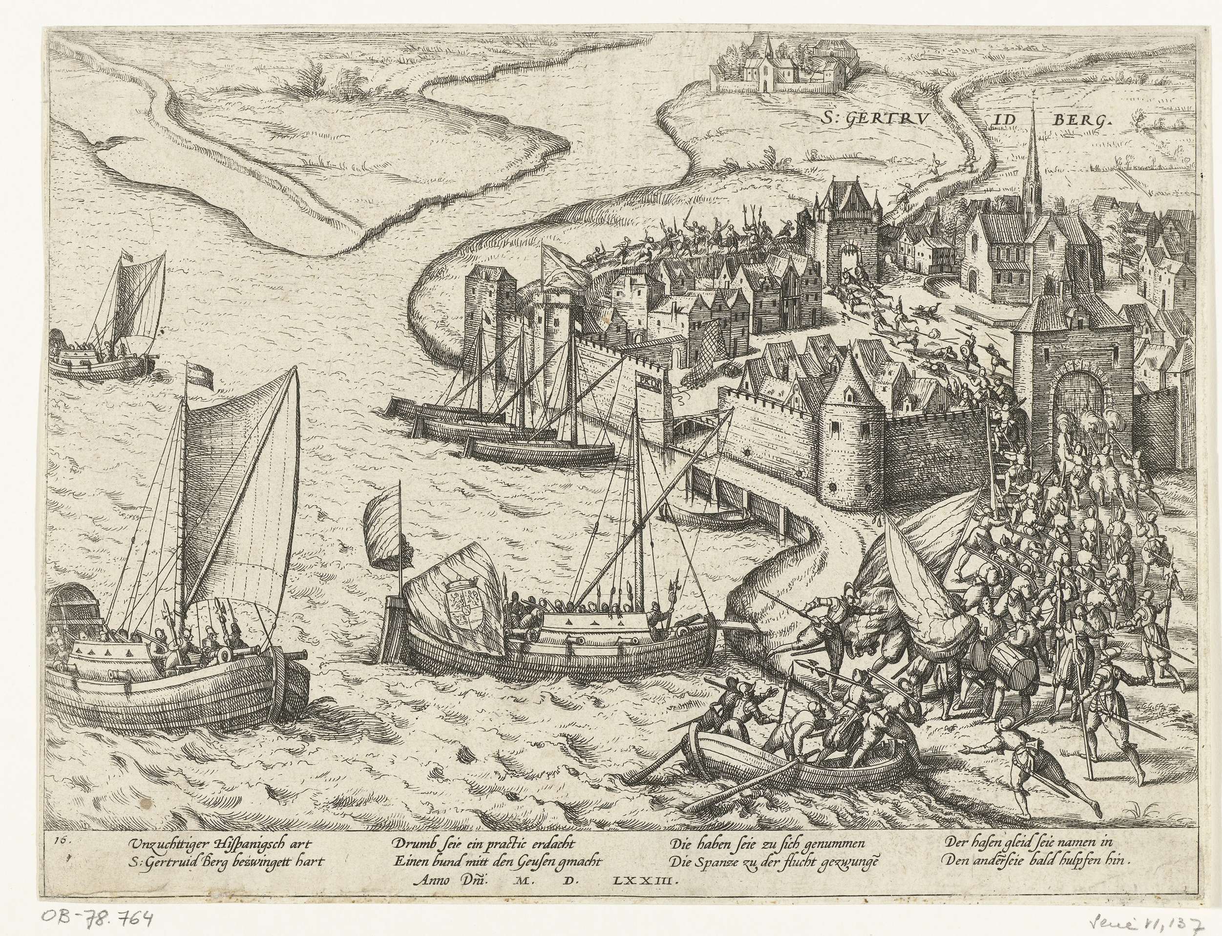 Inname van Geertruidenberg door de watergeuzen op 28 augustus 1573. Soldaten komen op de voorgrond aan land en bestormen de stad. In het water enkele kleine schepen met vlaggen. Met onderschrift van 8 regels in het Duits. Genummerd: 16.