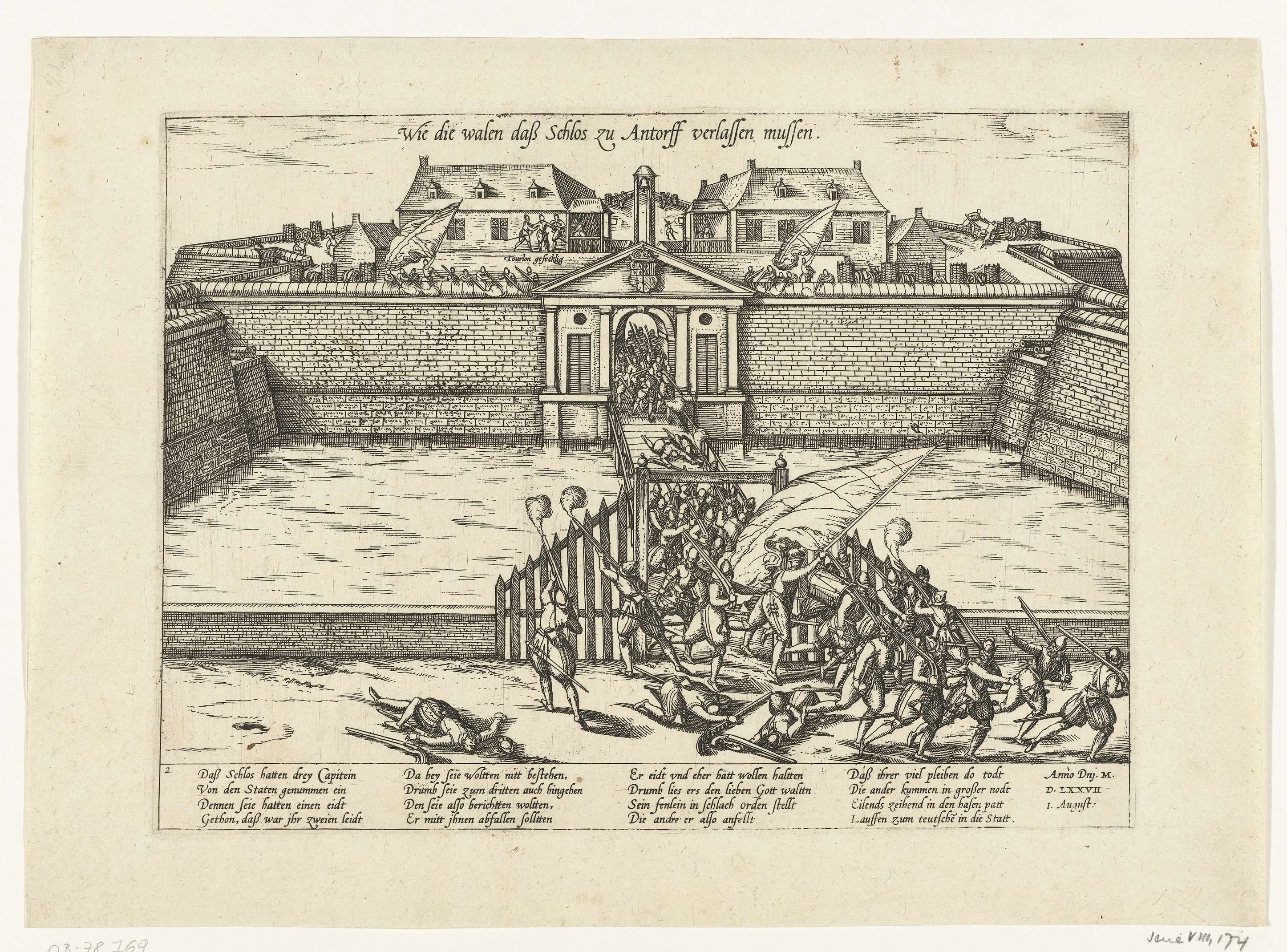 De Waalse eenheden verlaten de citadel van Antwerpen, 1 augustus 1577. De militaire gouverneur Blois van Treslong wordt gevangengenomen. Met onderschrift van 16 regels in het Duits. Genummerd: 2.