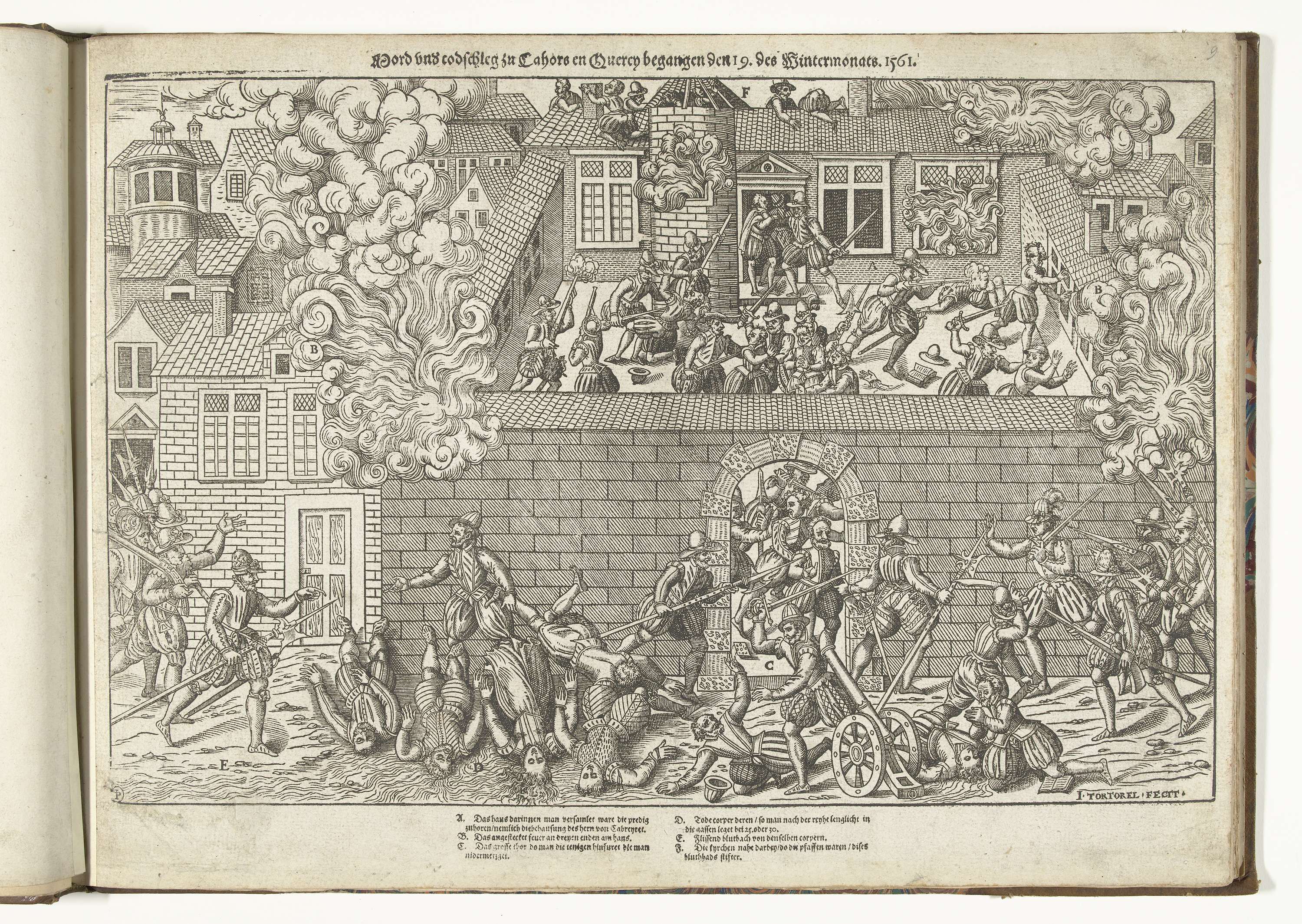 Moord op de protestanten te Cahors, 19 november 1561. Het huis waarin een bijeenkomst plaats vindt wordt in brand gestoken en de vluchtende protestanten worden gedood. In het onderschrift de legenda A-F in het Duits. Ongenummerd.