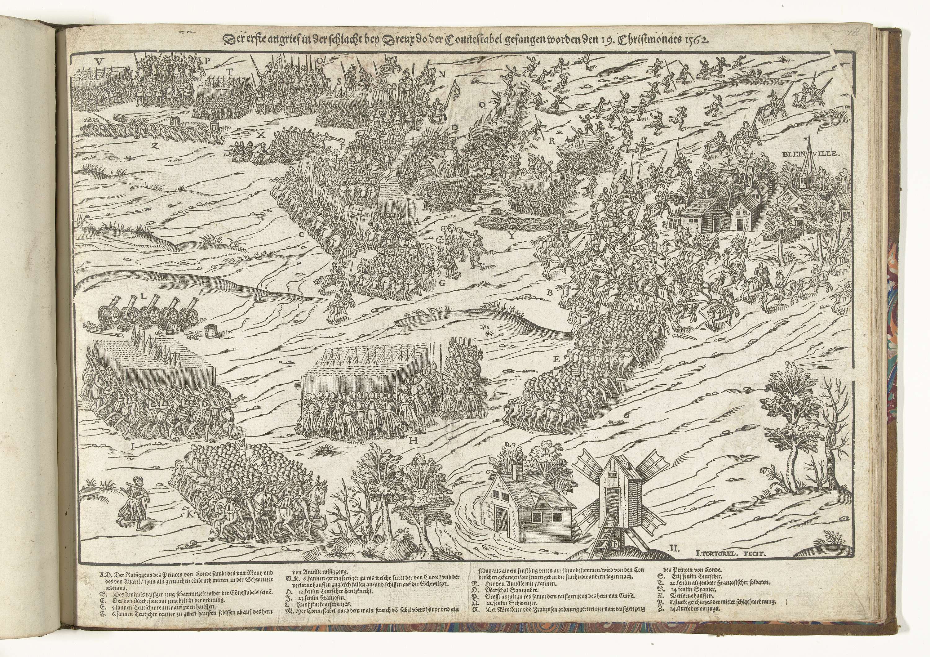 Slag bij Dreux tussen de hugenoten en de katholieken, eerste treffen, 19 december 1562. Gezicht op het slagveld. In het onderschrift de legenda A-Z in het Duits. Ongenummerd.