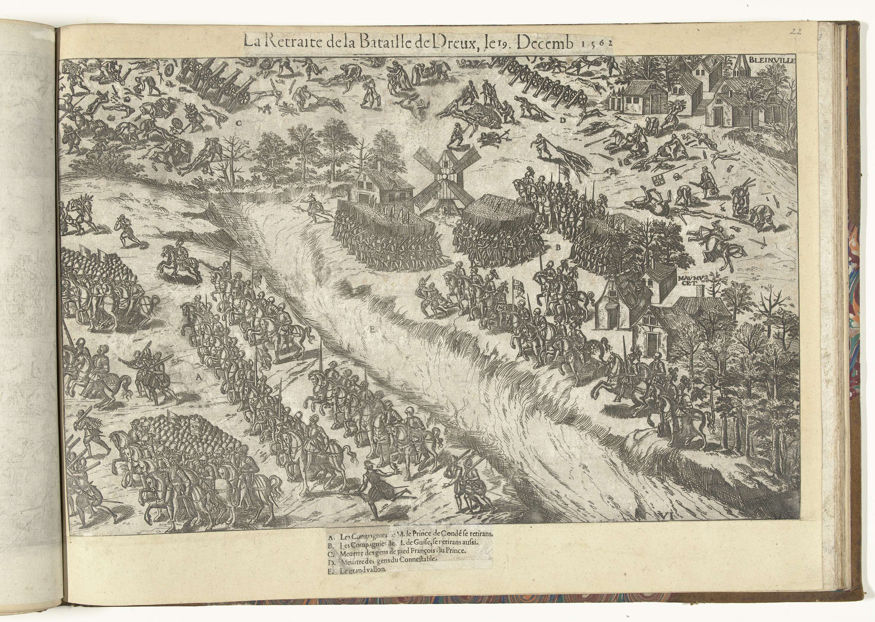 Aftocht na de slag bij Dreux tussen de hugenoten en de katholieken, 19 december 1562. De legers verlaten het slagveld. In het onderschrift de legenda A-E in het Frans. Ongenummerd.