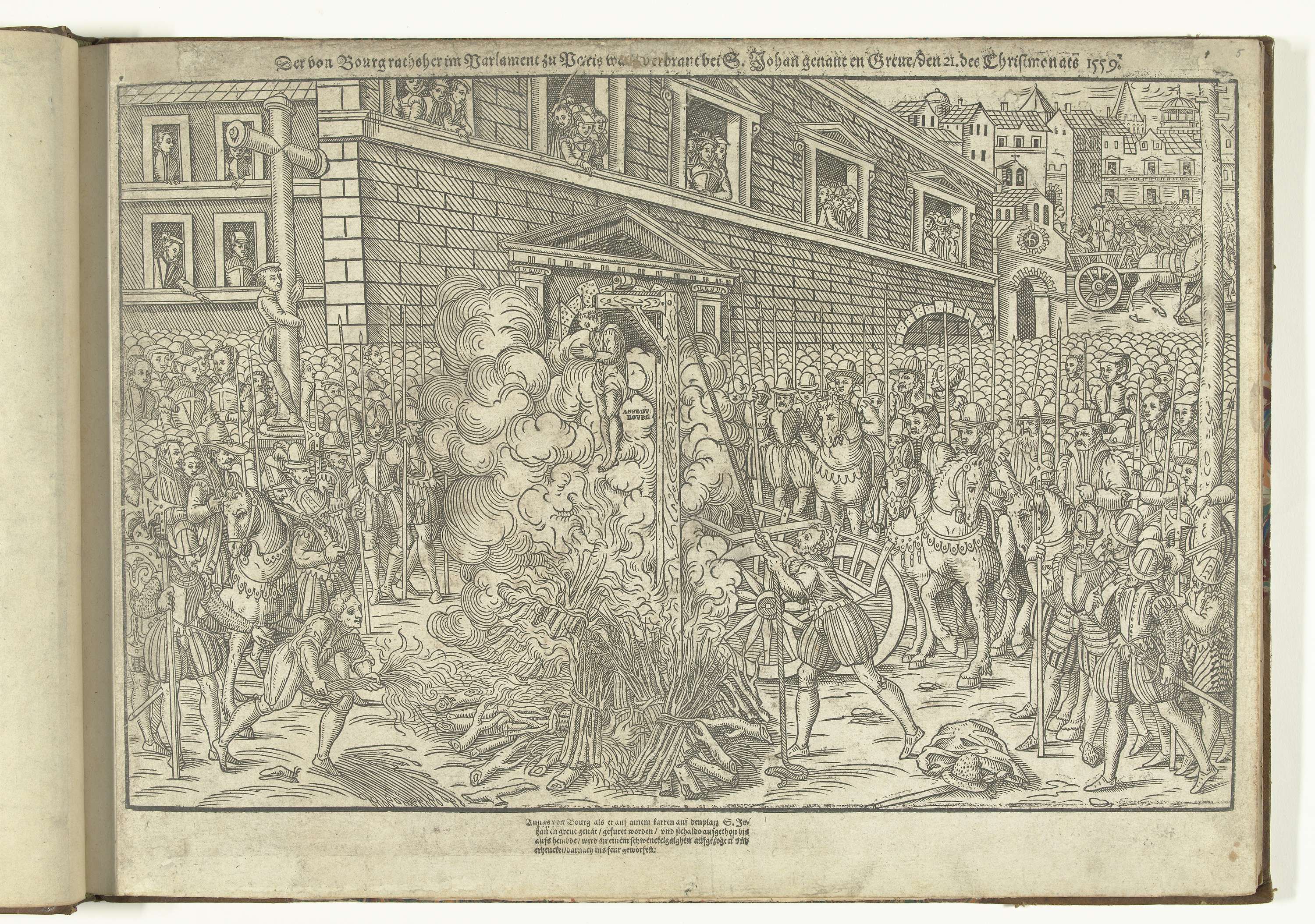 Terechtstelling van Anne du Bourg, Parijs 23 december 1559 (op de prent vermeld als 21 december). Du Bourg wordt voor een grote menigte opgehangen en zijn lichaam verbrand. Met onderschrift van 4 regels in het Duits. Ongenummerd.