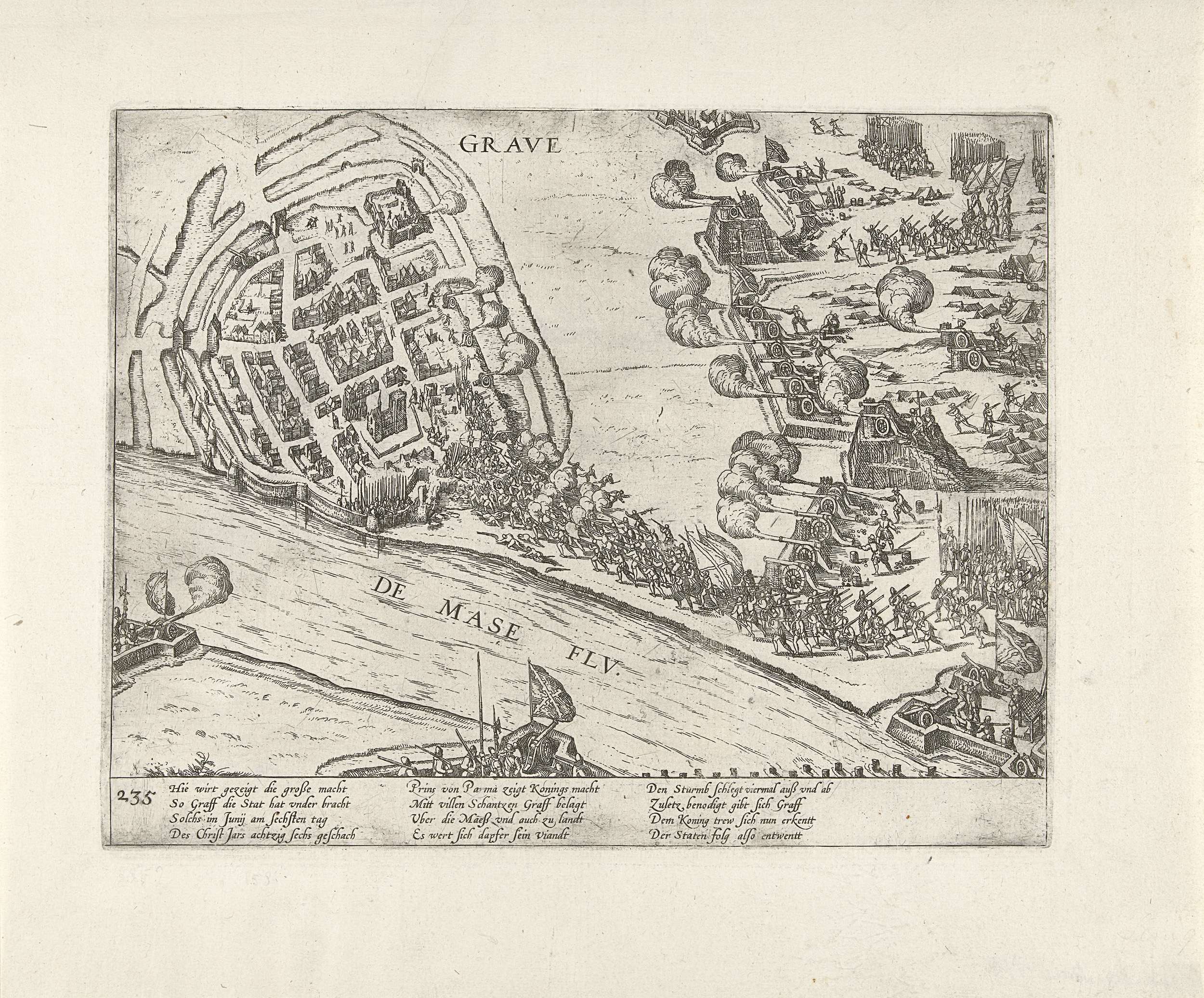Beleg en inname van Grave door Parma, 6 juni 1586. Het leger van Parma bestormt een bres in de muren. Op de voorgrond de Maas. Met onderschrift van 12 regels in het Duits. Genummerd: 235.