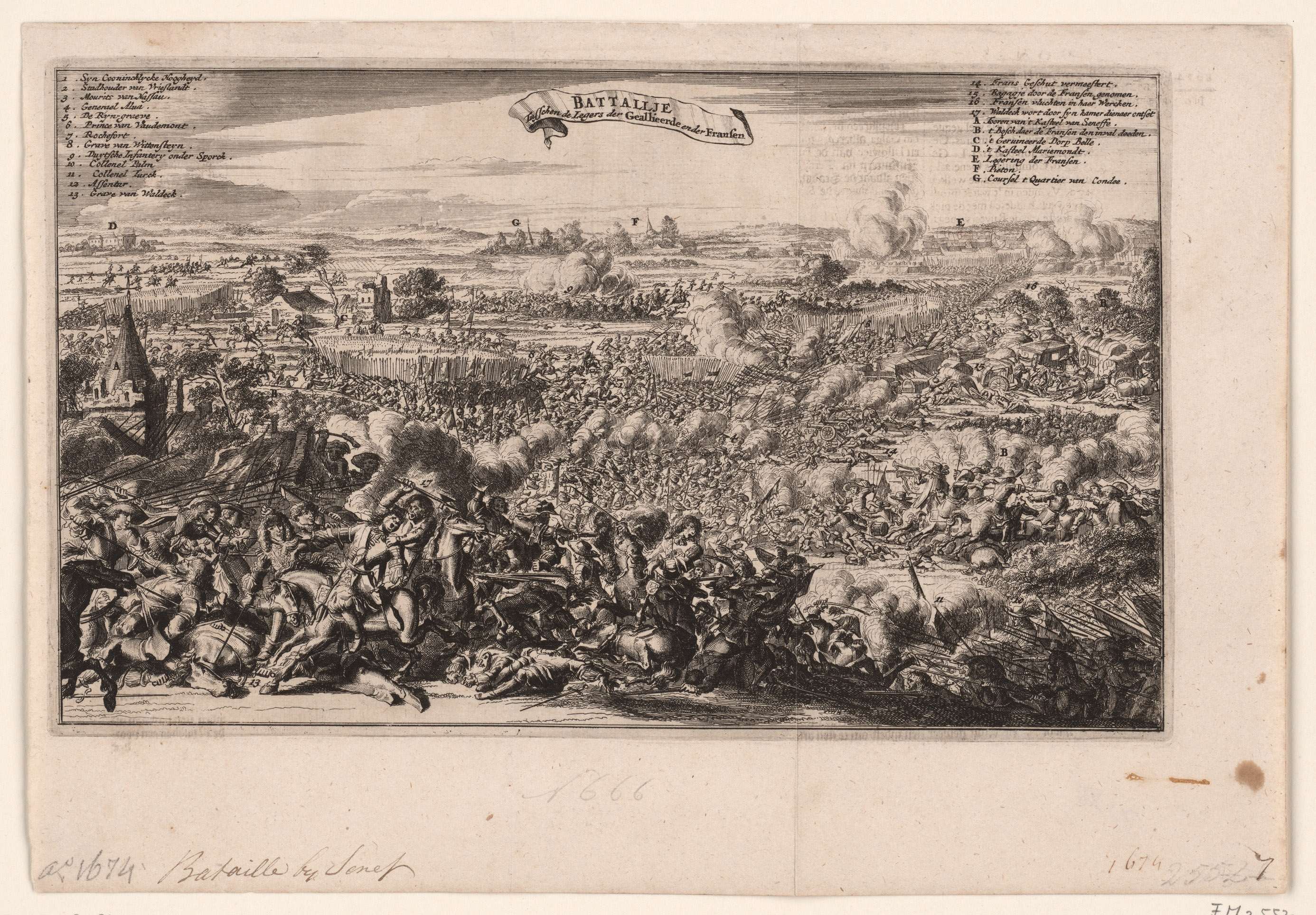 Slag bij Seneffe op 11 juli 1674 tussen de geallieerde Spaanse, Staatse en keizerlijke troepen enerzijds en de Fransen onder de prins van Condé anderzijds. Boven links en rechts de legenda 1-23 in het Nederlands.
