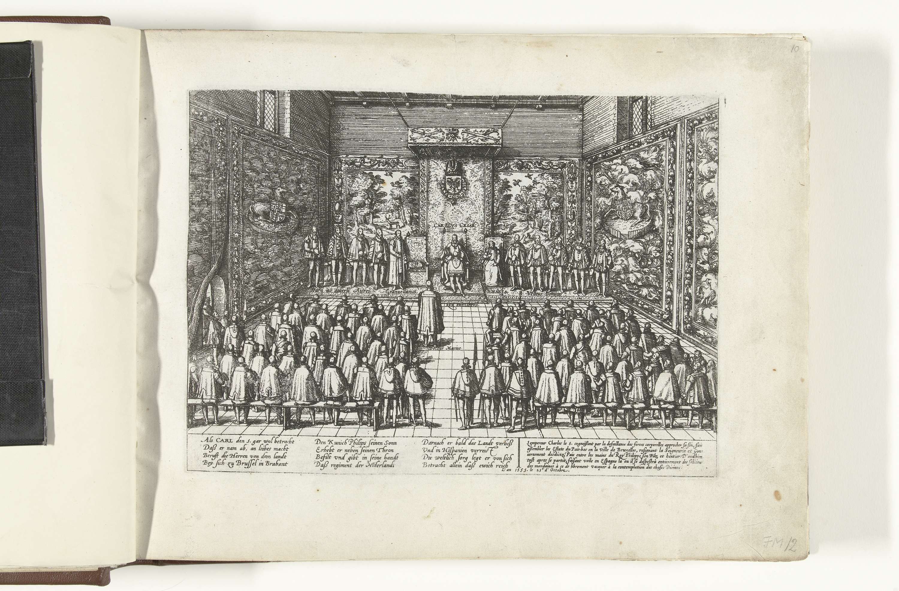 Karel V doet afstand van de troon, 25 oktober 1555. In de troonzaal knielt Filips voor zijn vader. Links Granvelle, rechts Margaretha van Parma en vliesridders. Ten overstaan van een Ten overstaan van de volledige vergadering van de Staten-Generaal staande voor houten banken met kussens. De muren versierd met wandtapijten. Met onderschrift van 12 regels ...