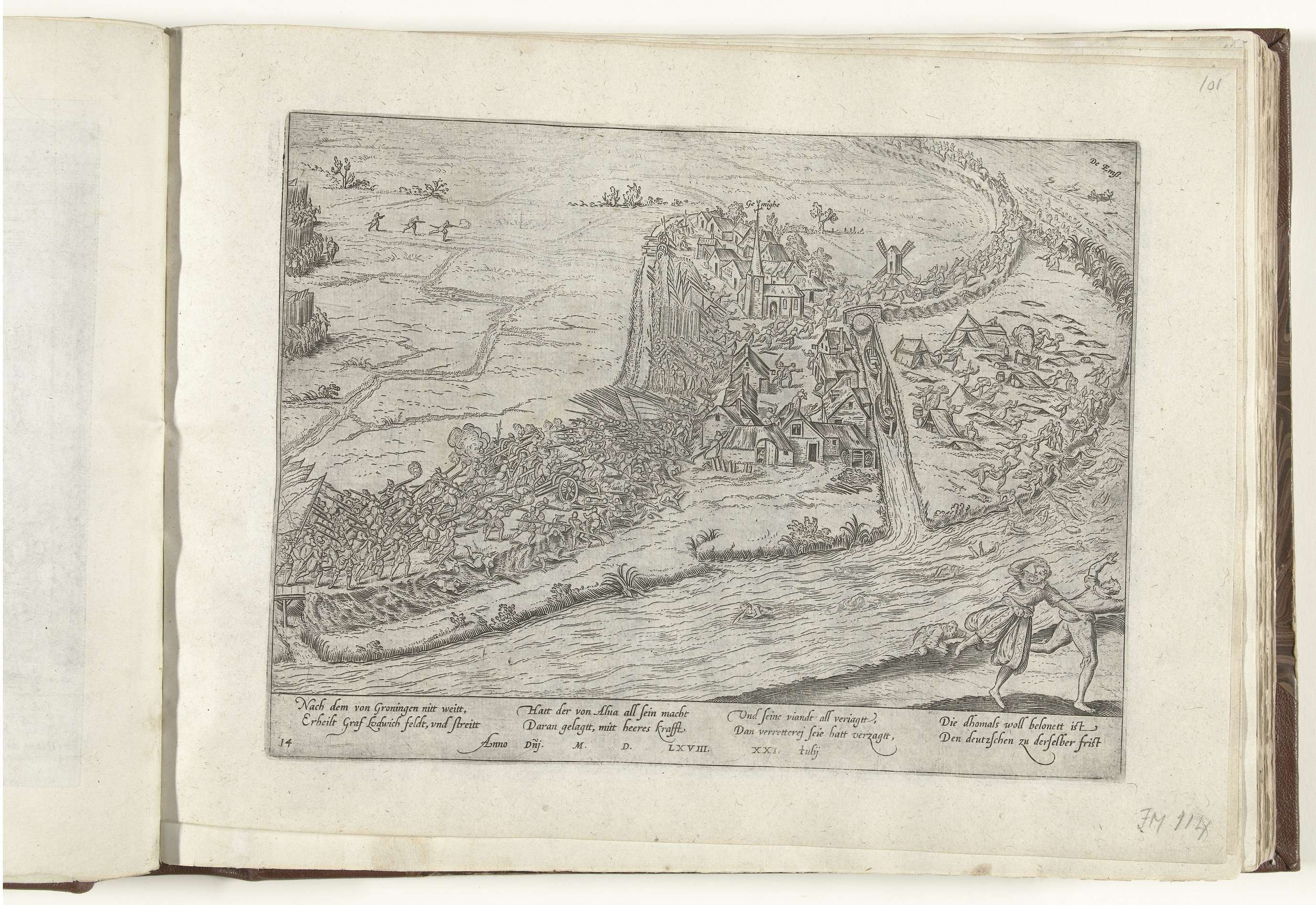 Slag bij Jemmingen, 21 juli 1568. Het leger van Lodewijk van Nassau wordt door Alva verslagen bij het dorpje Jemmingen. Sommigen redden zich door in het water van de rivier de Eems te springen. Met onderschrift van 8 regels in het Duits. Genummerd: 14.