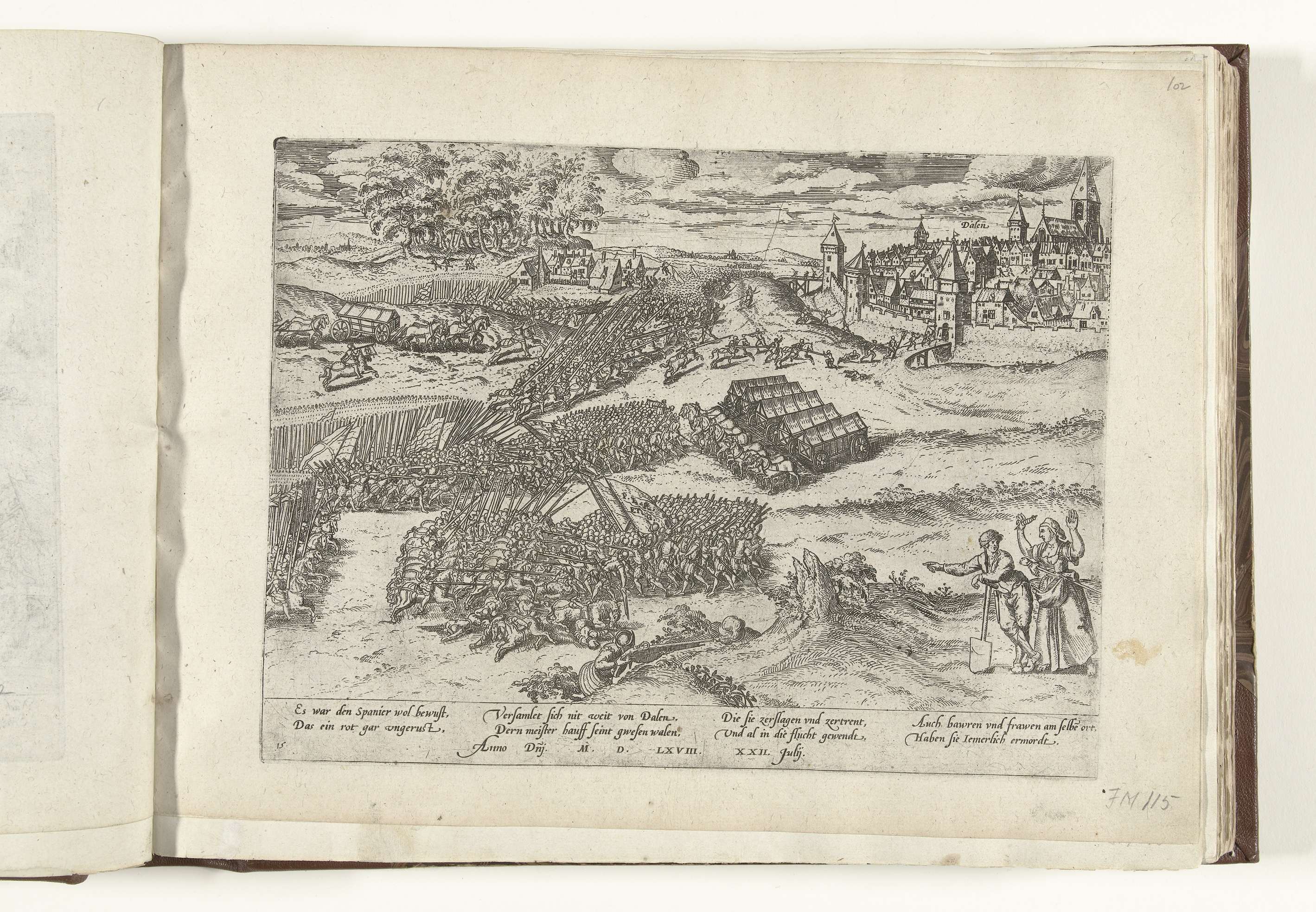 Slag bij Dahlen of Daalheim. Op de prent vermeld als 22 juli 1568, in werkelijkheid op 25 april. Op de voorgrond twee landlieden die kijken naar de veldslag, in de verte de stad Dahlen. Met onderschrift van 8 regels in het Duits. Genummerd: 15.