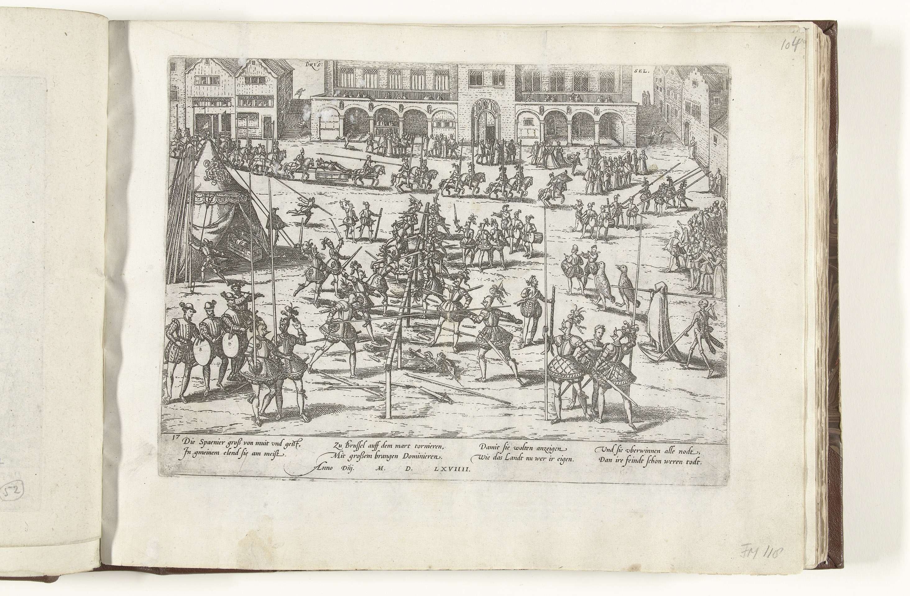 Toernooi op de Grote Markt te Brussel, 1569. Ridders in wapenrusting bevechten elkaar met lans en zwaard, van rechts komen enkele verklede figuren op het plein. Met onderschrift van 8 regels in het Duits. Genummerd: 17.