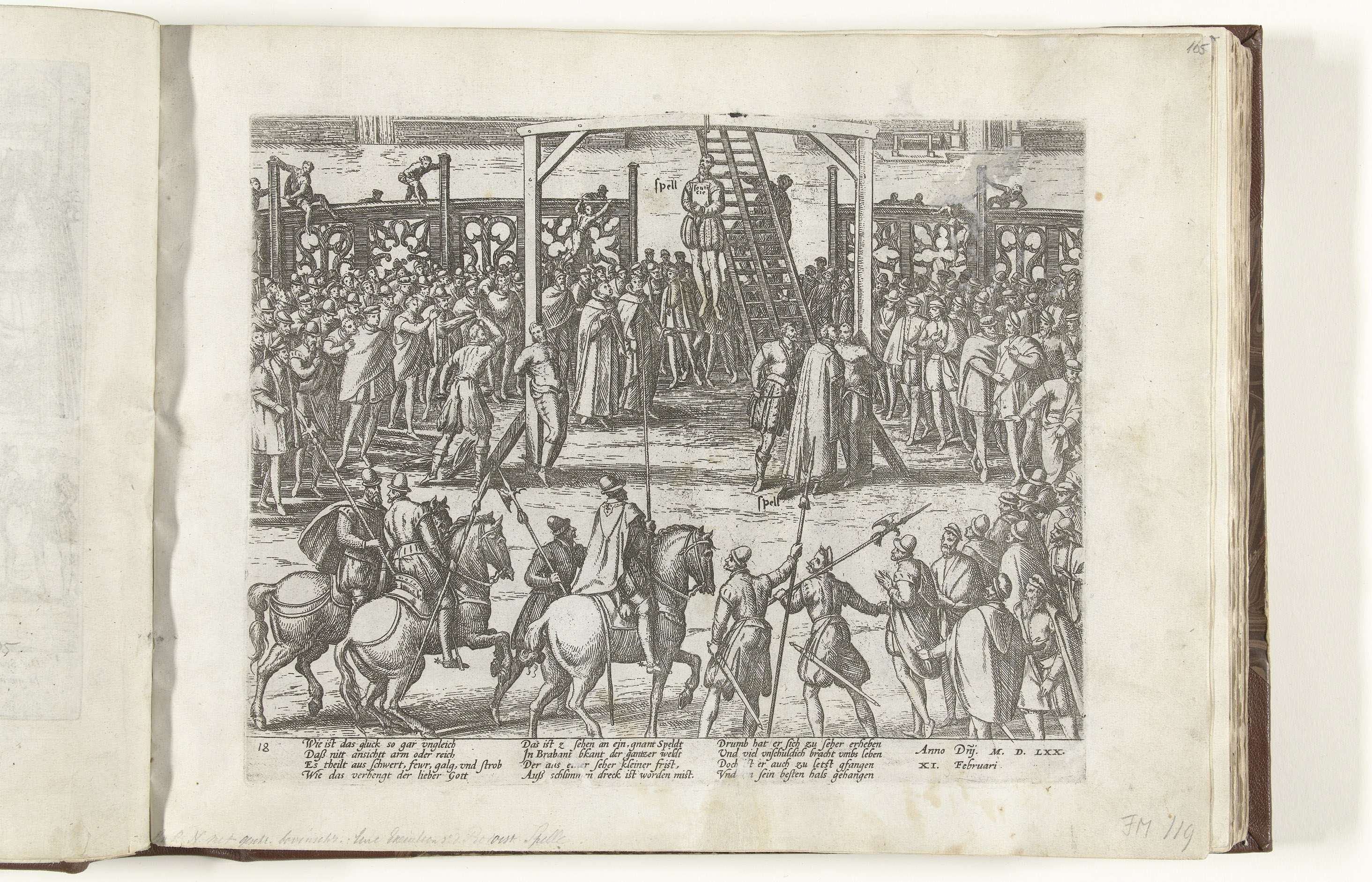 Executie door ophanging op last van Alva van de provoost Hans de Greef, alias Spell of Spelleken te Brussel, 11 februari 1570. Rechts kust Spell een van zijn medewerkers. In het midden hangt Spell aan de galg met zijn vonnis (sentencie) op de borst. Links wordt een andere van zijn medewerkers wordt gegeseld. Met onderschrift ...
