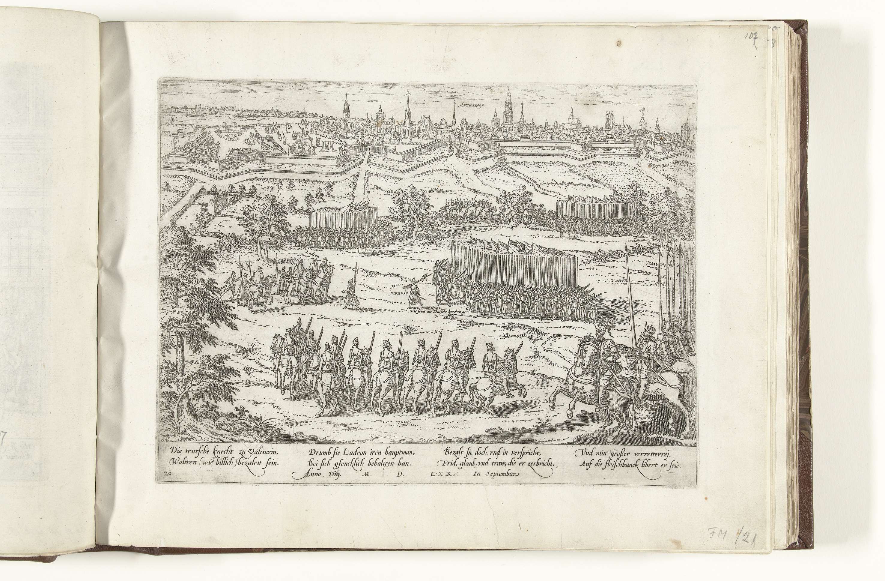 Gevangenneming van de Duitse soldaten buiten Antwerpen, op last van graaf Alberik van Ladron die eerder door deze soldaten was gegijzeld, september 1570. De Duitse huurlingen worden omsingeld door Spaanse troepen. Op de achtergrond de stad Antwerpen met links een kleine scène van de terechtstelling van enkele soldaten in de citadel. Met onderschrift van 8 ...