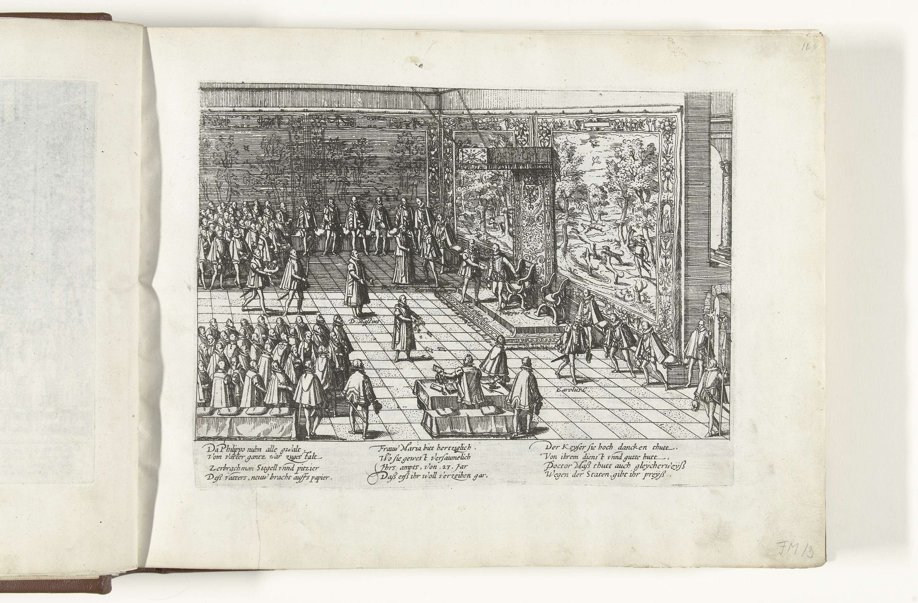 Karel V doet afstand van de troon, 25 oktober 1555. In de troonzaal neemt Filips II plaats op de troon en verlaat Karel V de zaal. De zegels van Karel V worden verbroken en vervangen door die van Filips II. Ten overstaan van de volledige vergadering van de Staten-Generaal. De muren versierd met wandtapijten met ...