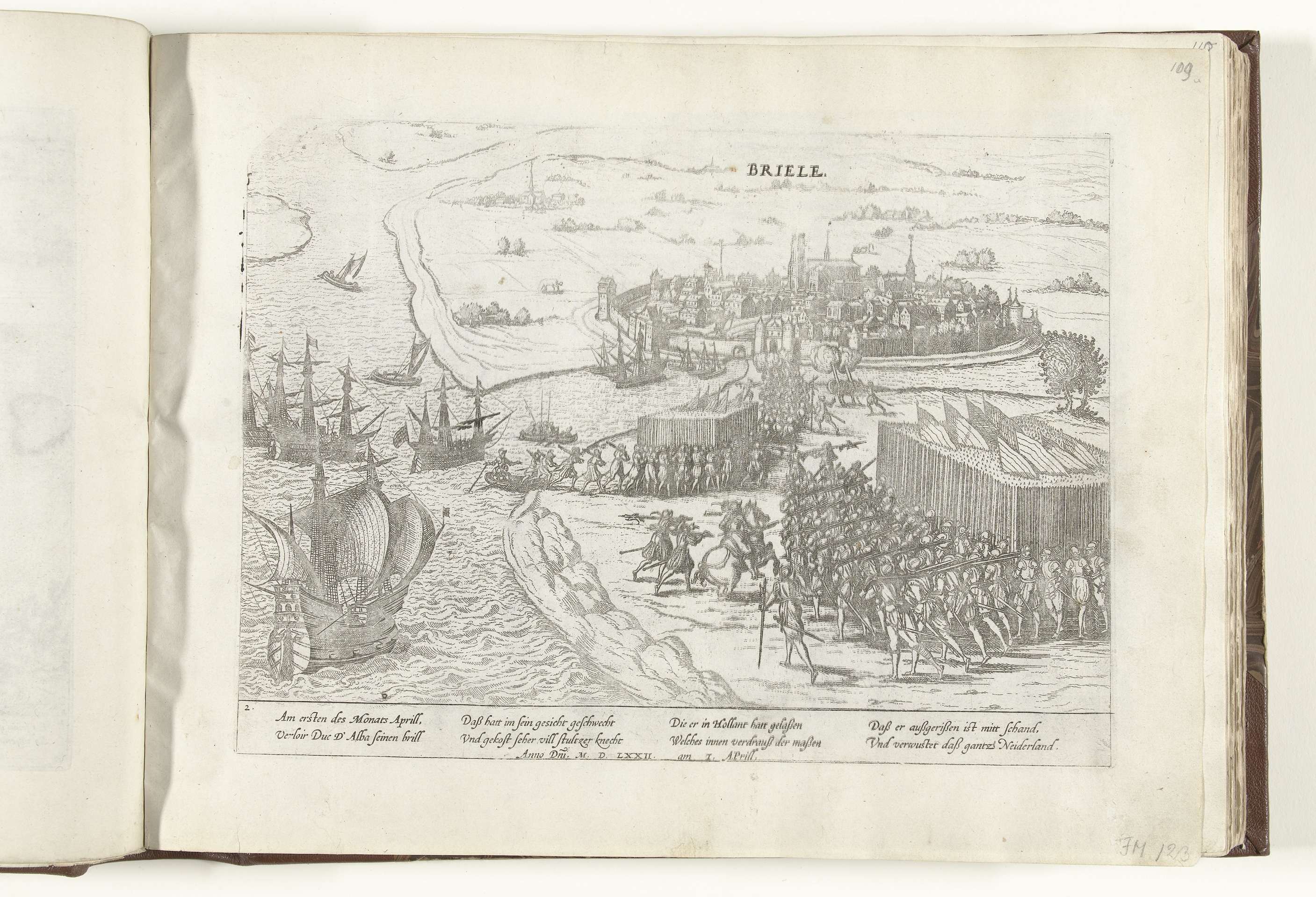 Watergeuzen nemen Den Briel in, 1 april 1572. De watergeuzen komen aan land, trekken op en veroveren onder leiding van Lumey Den Briel. Met onderschrift van 8 regels in het Duits. Genummerd: 2.