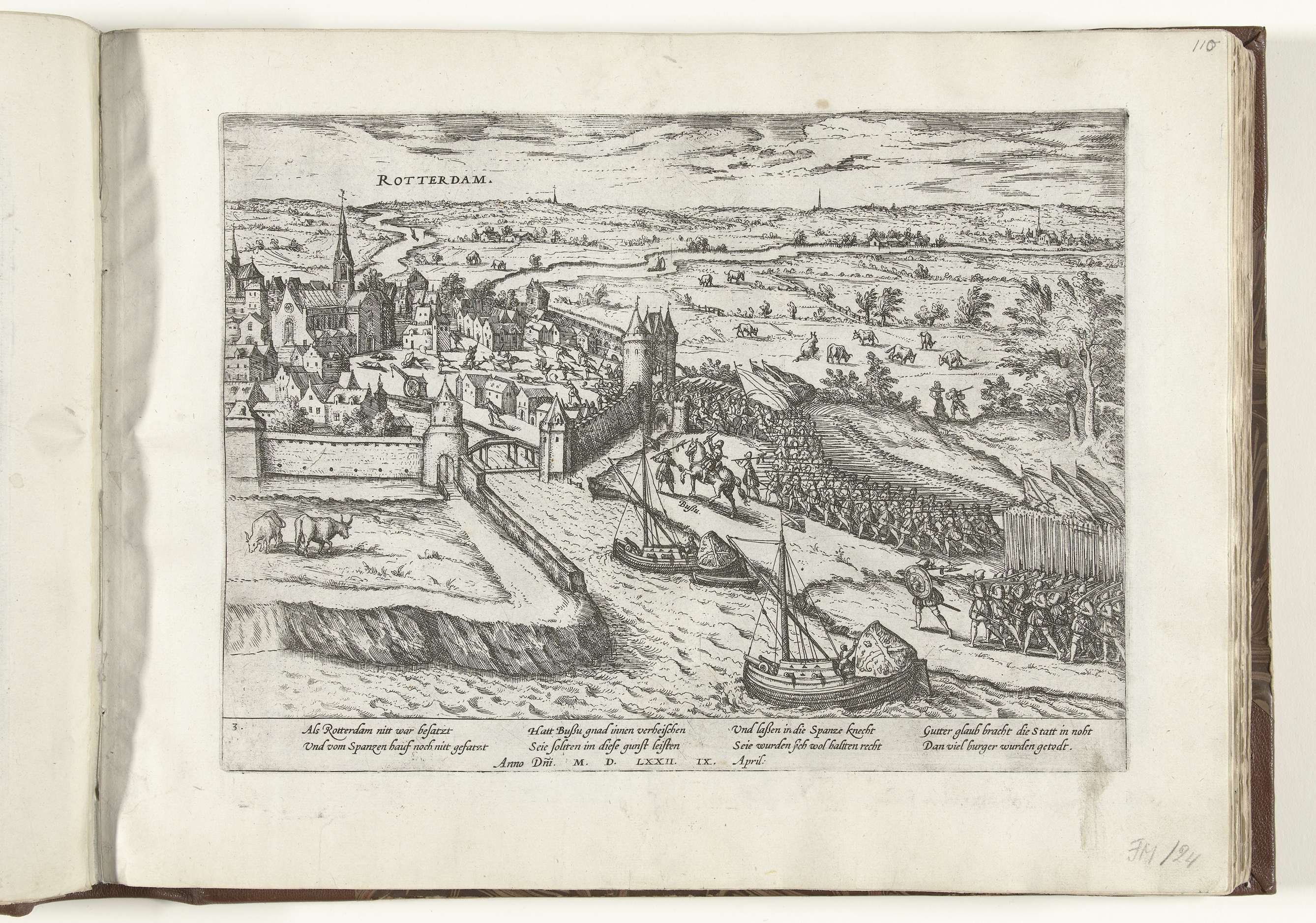 Graaf Bossu valt met Spaanse troepen Rotterdam binnen en doodt er vele burgers, 9 april 1572. De soldaten marcheren door de poort de stad binnen, in de straten worden inwoners gedood. Met onderschrift van 8 regels in het Duits. Genummerd: 3.