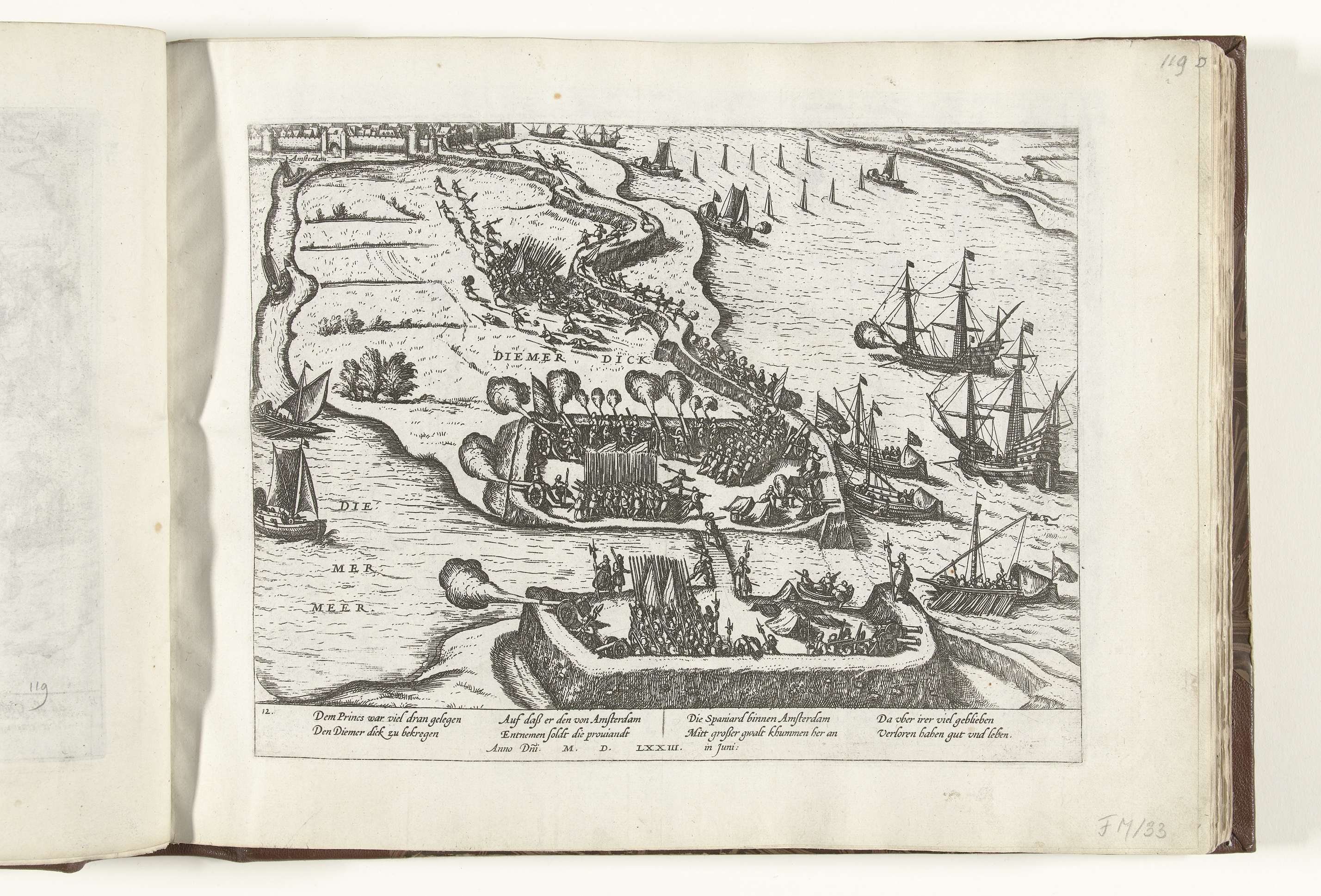 Slag op de Diemerdijk bij Amsterdam, juni 1573. De Diemerdijk door soldaten onder Sonoy op 2 juni veroverd, doorgegraven, versterkt en bezet gehouden tot 17 juli. Met onderschrift van 8 regels in het Duits. Genummerd: 12.