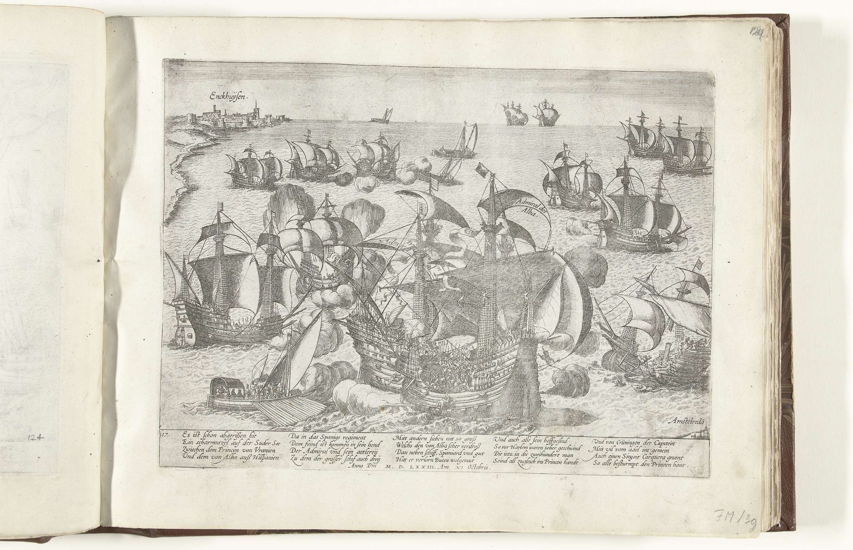 De slag op de Zuiderzee, 11 oktober 1573. Zeeslag waarbij de vloot van de watergeuzen onder leiding van Cornelis Dirkszoon van Monnickendam de Spaanse vloot van Bossu verslaat. Links in de verte Enkhuizen. Met onderschrift van 20 regels in het Duits. Genummerd: 17.