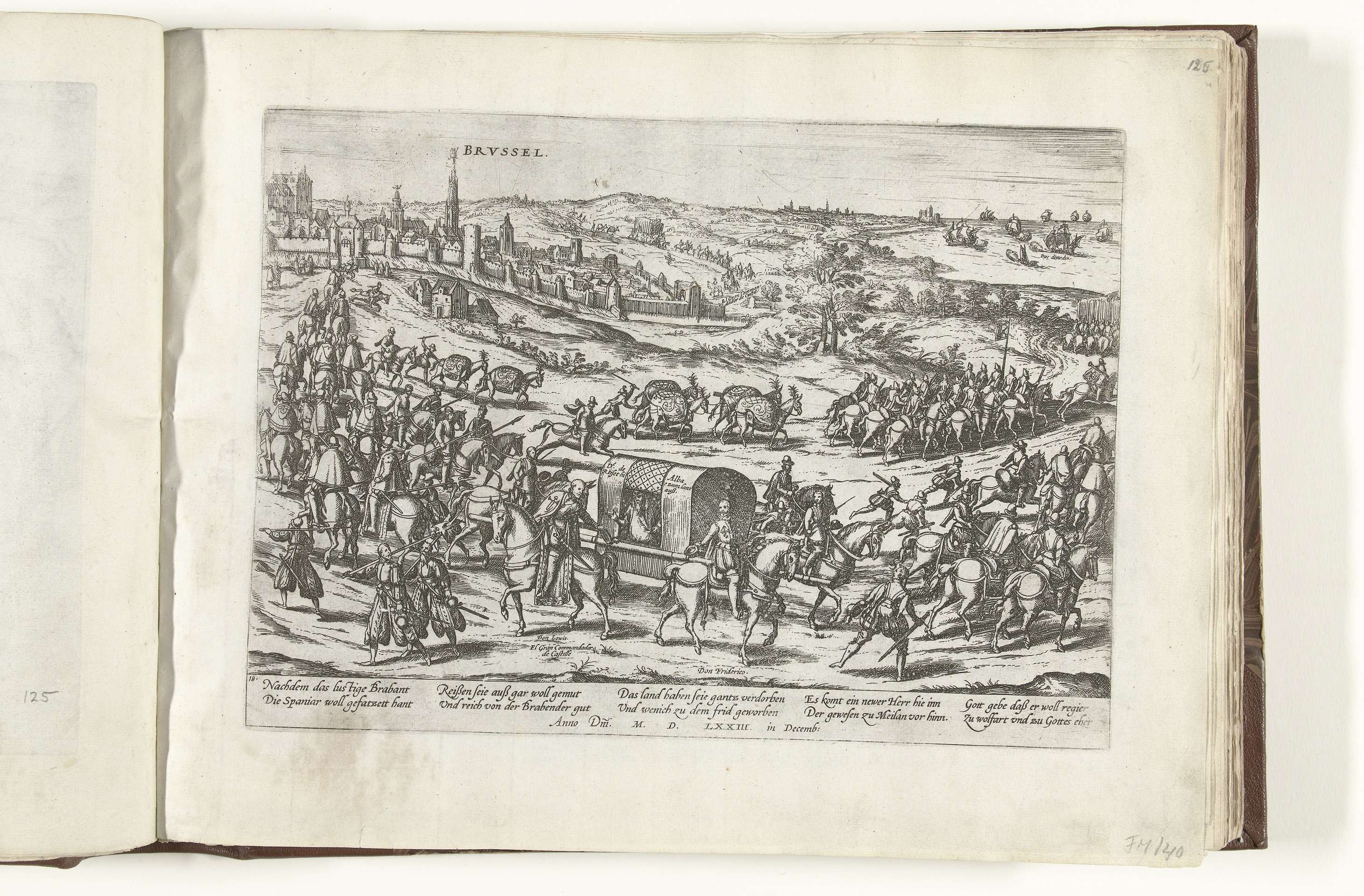 Alva verlaat de Nederlanden, december 1573. In een grote stoet vertrekt de hertog in een draagstoel uit Brussel naar Spanje. Hij groet de nieuwe landvoogd Requesens die richting Brussel rijdt. Met onderschrift van 10 regels in het Duits. Genummerd: 18.