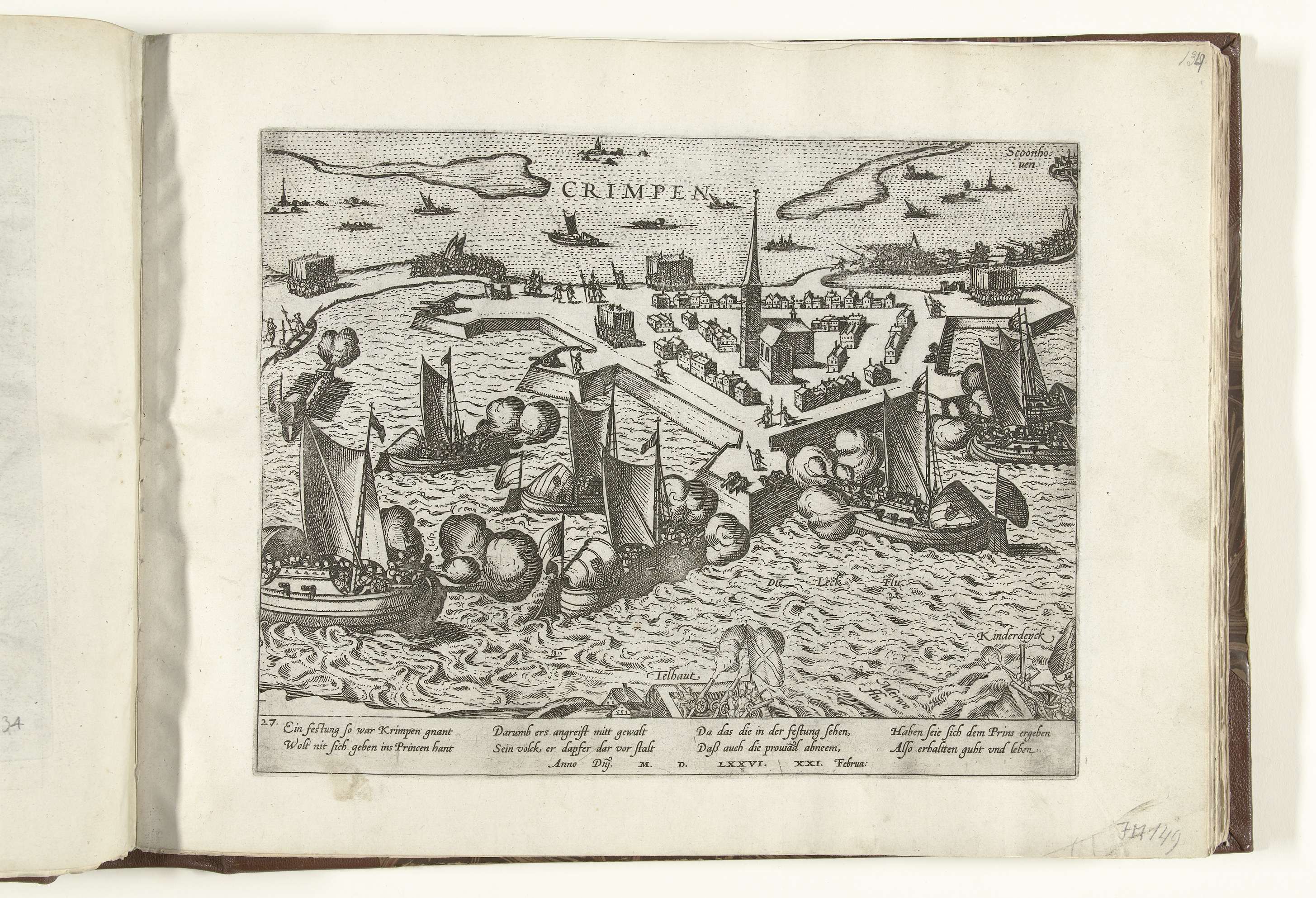 Beleg van Krimpen aan de Lek door het leger van de prins. Schepen van de prins beschieten het versterkte stadje vanaf het water. Op 21 februari 1576 geeft Krimpen zich over. Met onderschrift van 8 regels in het Duits. Genummerd: 27.