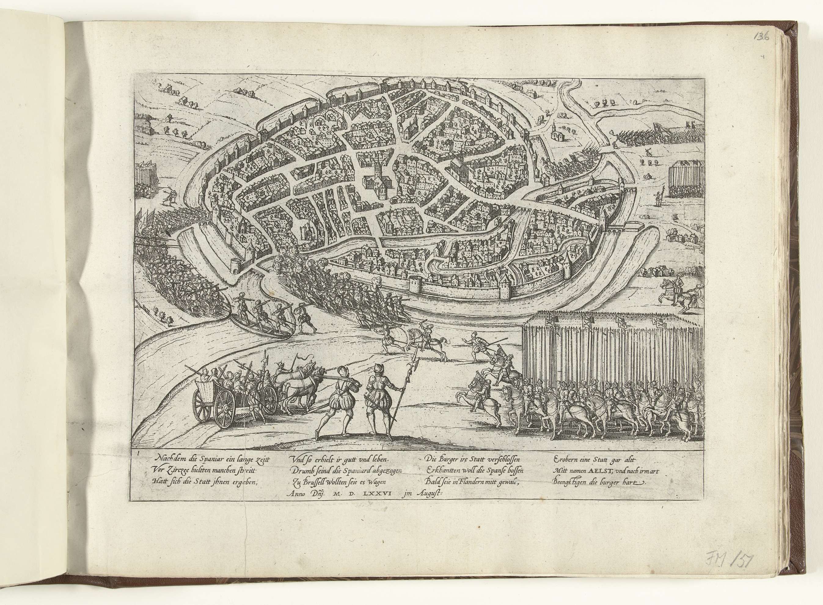 Muitende Spaanse soldaten bestormen en plunderen de stad Aalst, 28 augustus 1576. Met onderschrift van 12 regels in het Duits. Genummerd: 1.