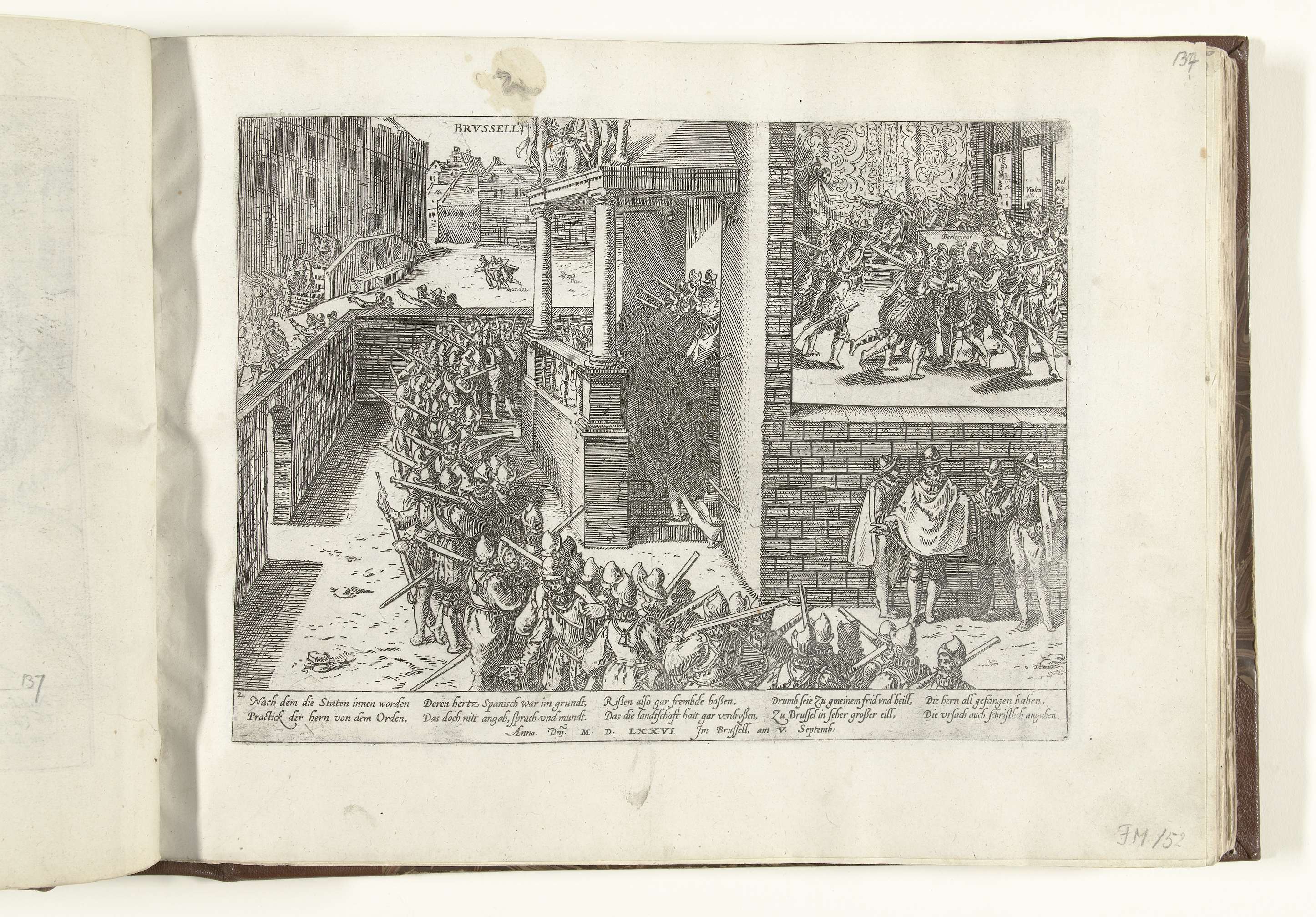 De leden van de Spaansgezinde Raad van State worden in Brussel gevangengenomen, 5 september 1576. Soldaten overvallen het gebouw waar de Raad bijeen was. Boven worden Van Mansfeld, Berlaymont, Viglius en Del Rio gearresteerd. Met onderschrift van 10 regels in het Duits. Genummerd: 2.