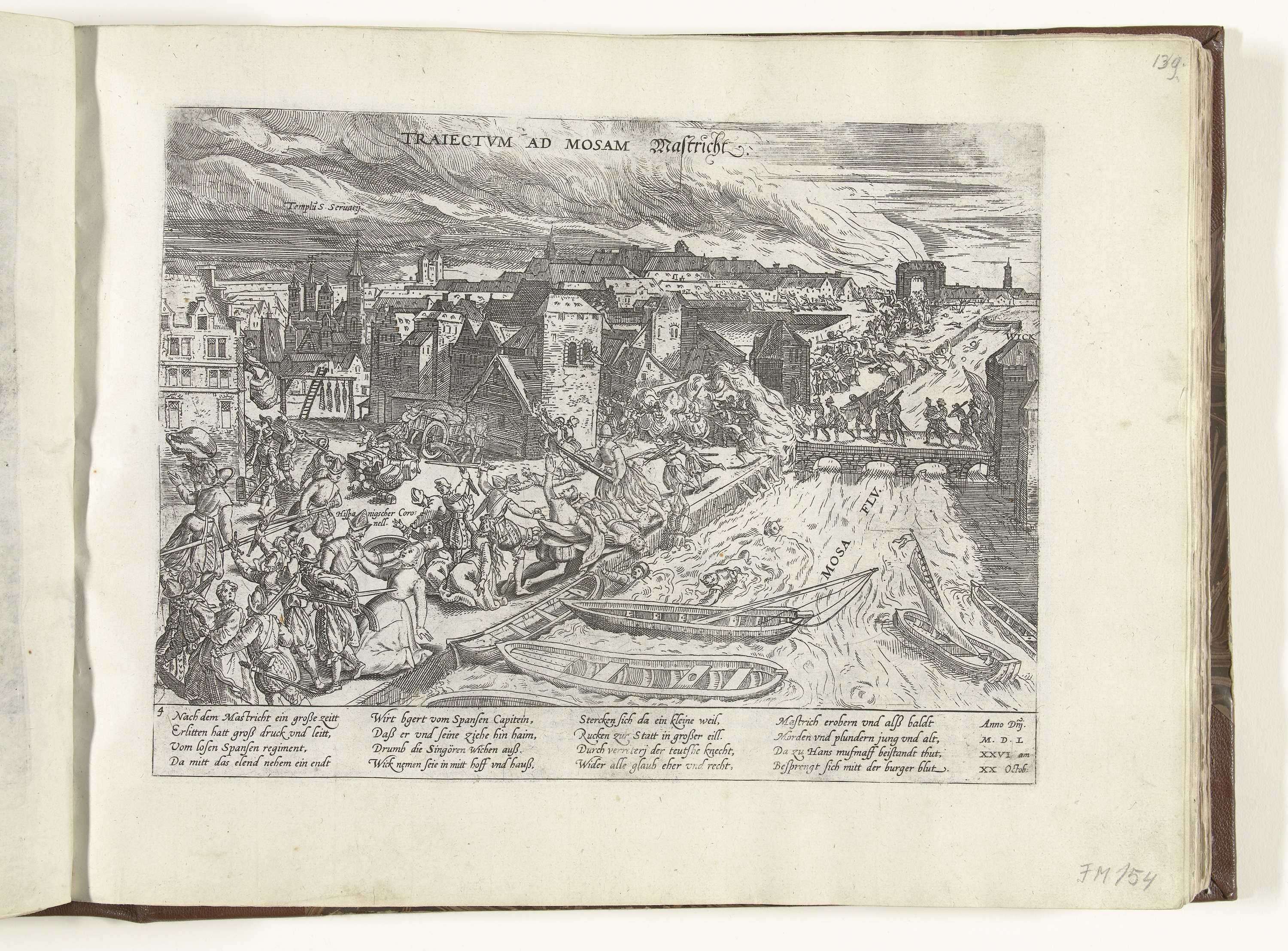 Moord en plundering door Spaanse soldaten te Maastricht, 20 oktober 1576. Langs de oever van de Maas doden Spaanse soldaten inwoners van de stad, in de rookwolken van brandende gebouwen. Met onderschrift van 16 regels in het Duits. Genummerd: 4.