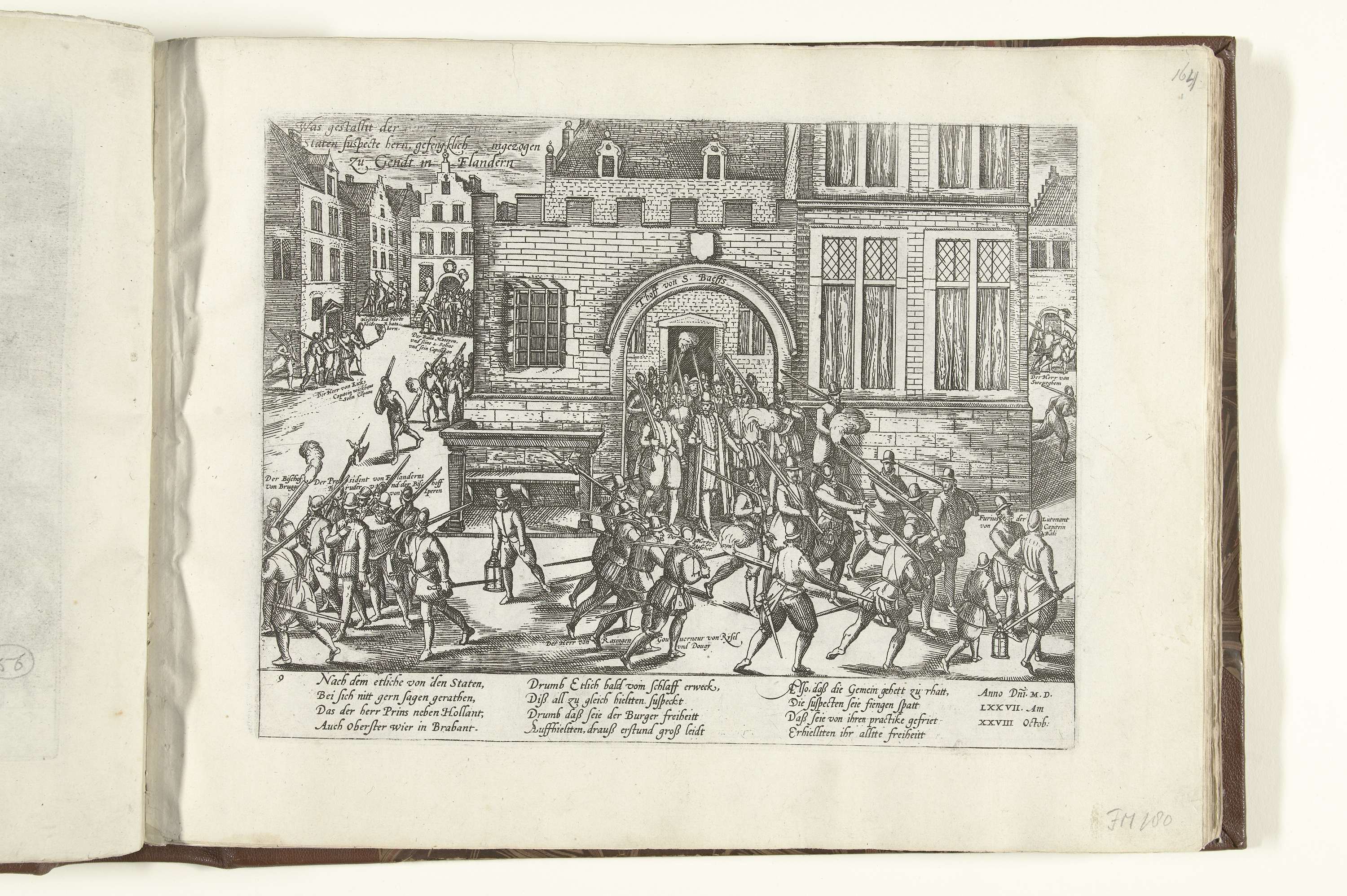 De gevangenneming van de hertog van Aarschot en andere edelen in het Hof van S. Baeffs te Gent, 28 oktober 1577. Met onderschrift van 12 regels in het Duits. Genummerd: 9.