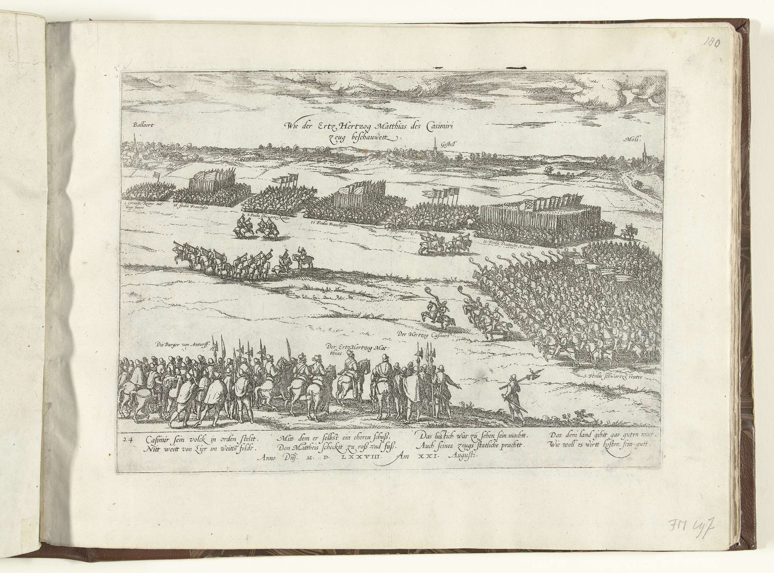 Aartshertog Matthias houdt revue over de troepen van paltsgraaf Casimir, 21 augustus 1578, bij Lier. Op de achtergrond de dorpen Ballaert, Gestel en Mol. Met onderschrift van 8 regels in het Duits. Genummerd: 24.