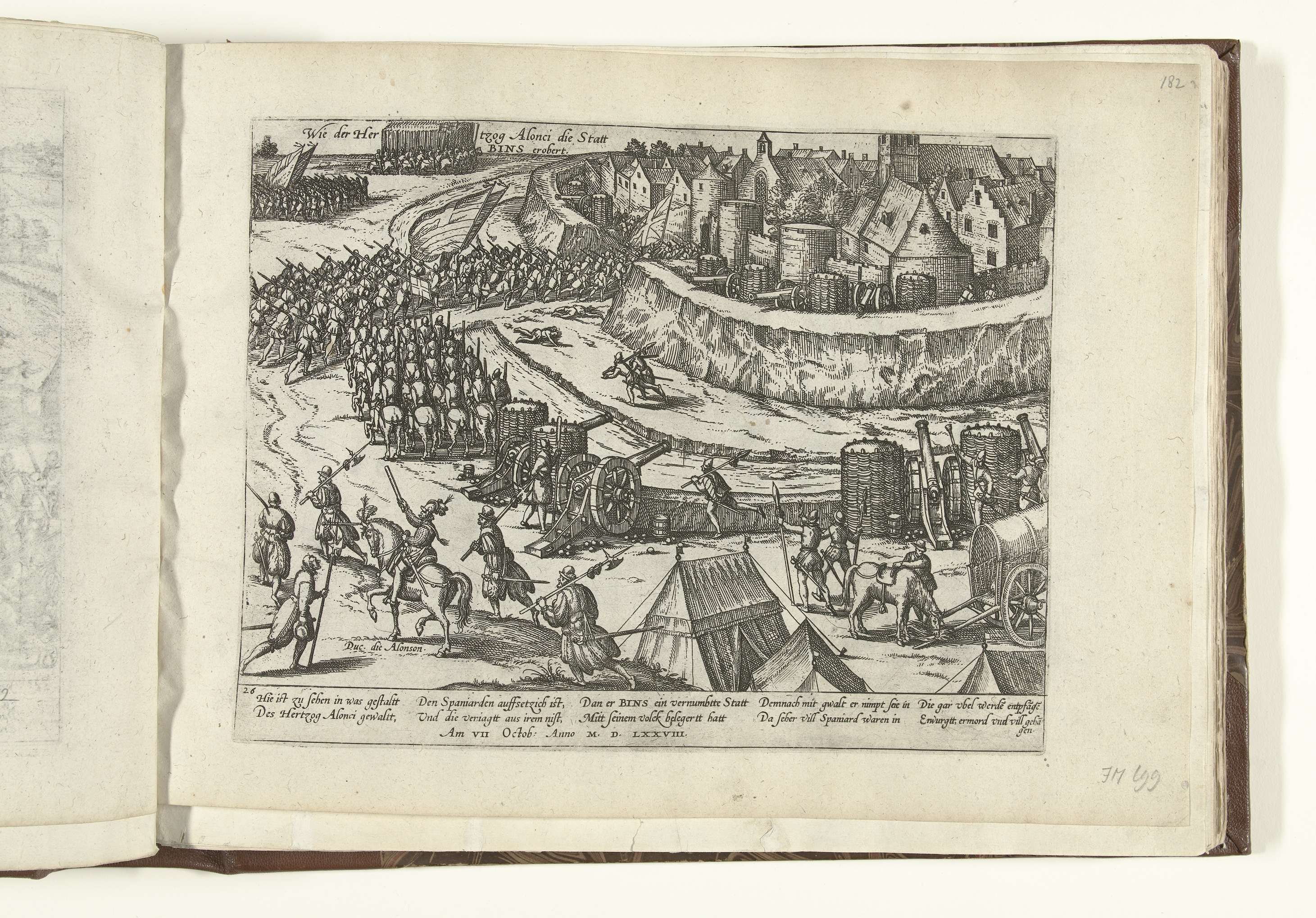 Na beleg geeft de stad Binche in Henegouwen zich over aan de hertog van Anjou, 7 oktober 1578. Op de voorgrond de hertog van Anjou te paard, boven trekken zijn legers de stad in. Met onderschrift van 10 regels in het Duits. Genummerd: 26.