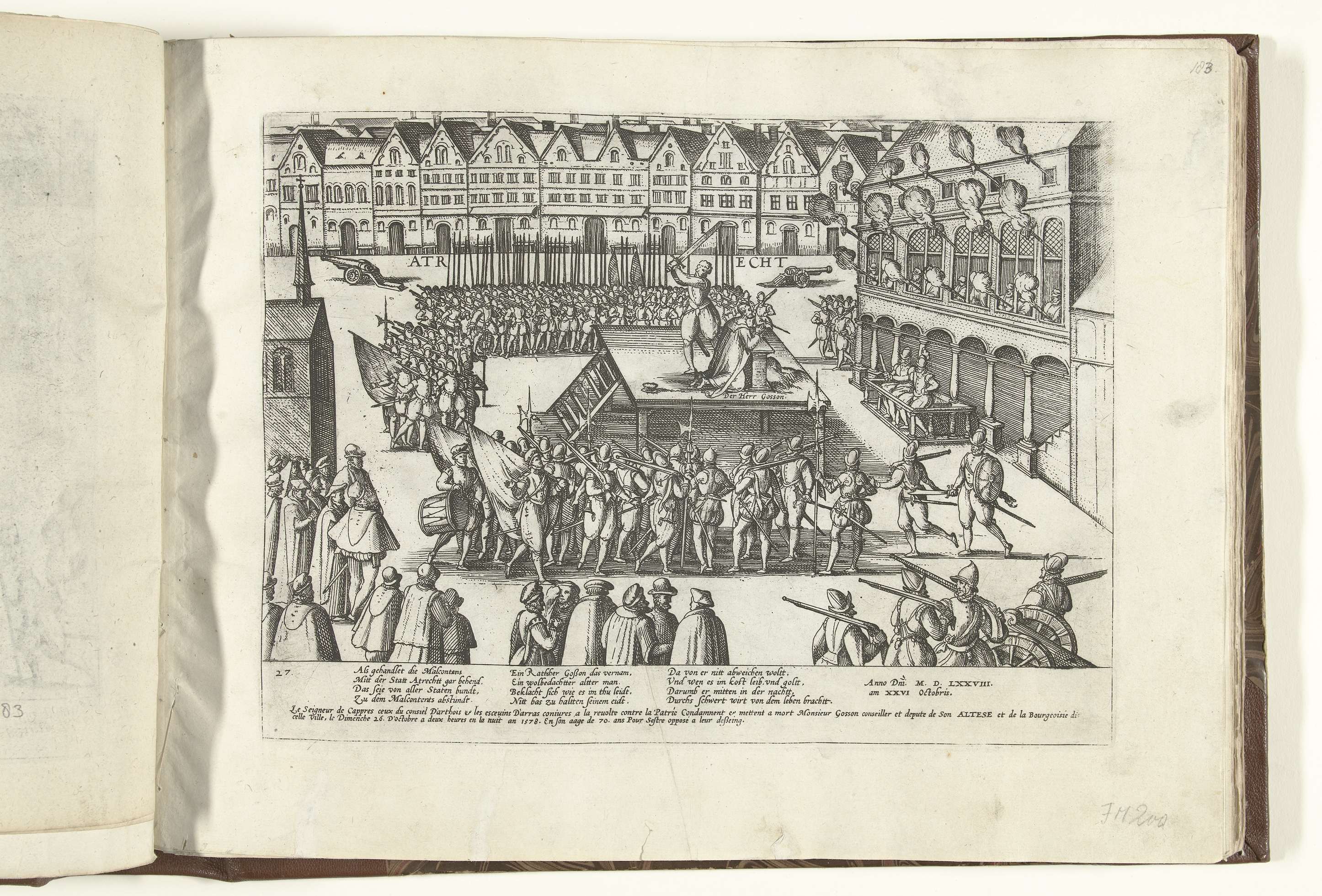 Onthoofding van de raadsheer Nicolas Gosson te Atrecht, wegens sympathie met de Malcontenten, 26 oktober 1578. Gosson knielt op het schavot op een plein. Met onderschrift van 12 regels in het Duits en 2 lange regels in het Frans. Genummerd: 27.