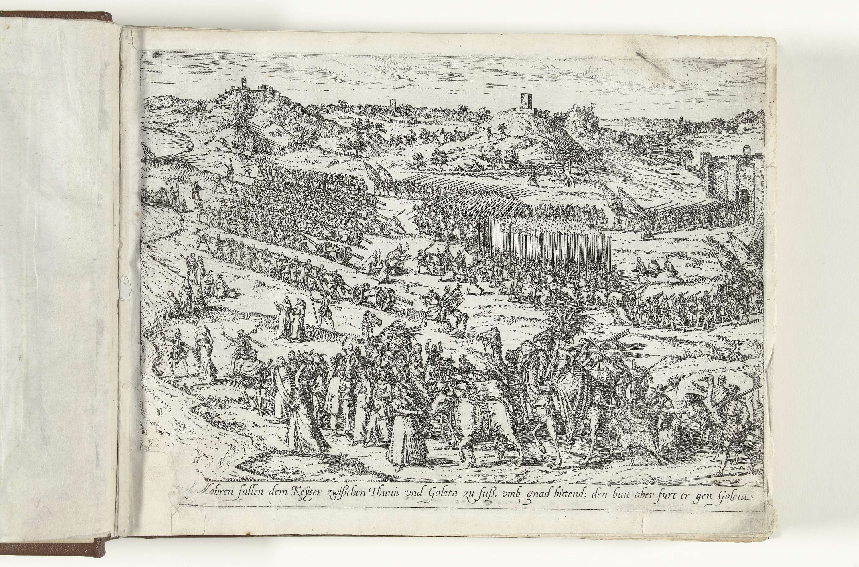 Vier Turken knielen met takken in de hand voor Karel V en smeken hem om genade, 1535. Het keizerlijke leger trekt door het land tussen Tunis en Goleta, op de voorgrond een stoet van burgers met allerlei dieren. Hoek linksonder met nummer [7] ontbreekt.