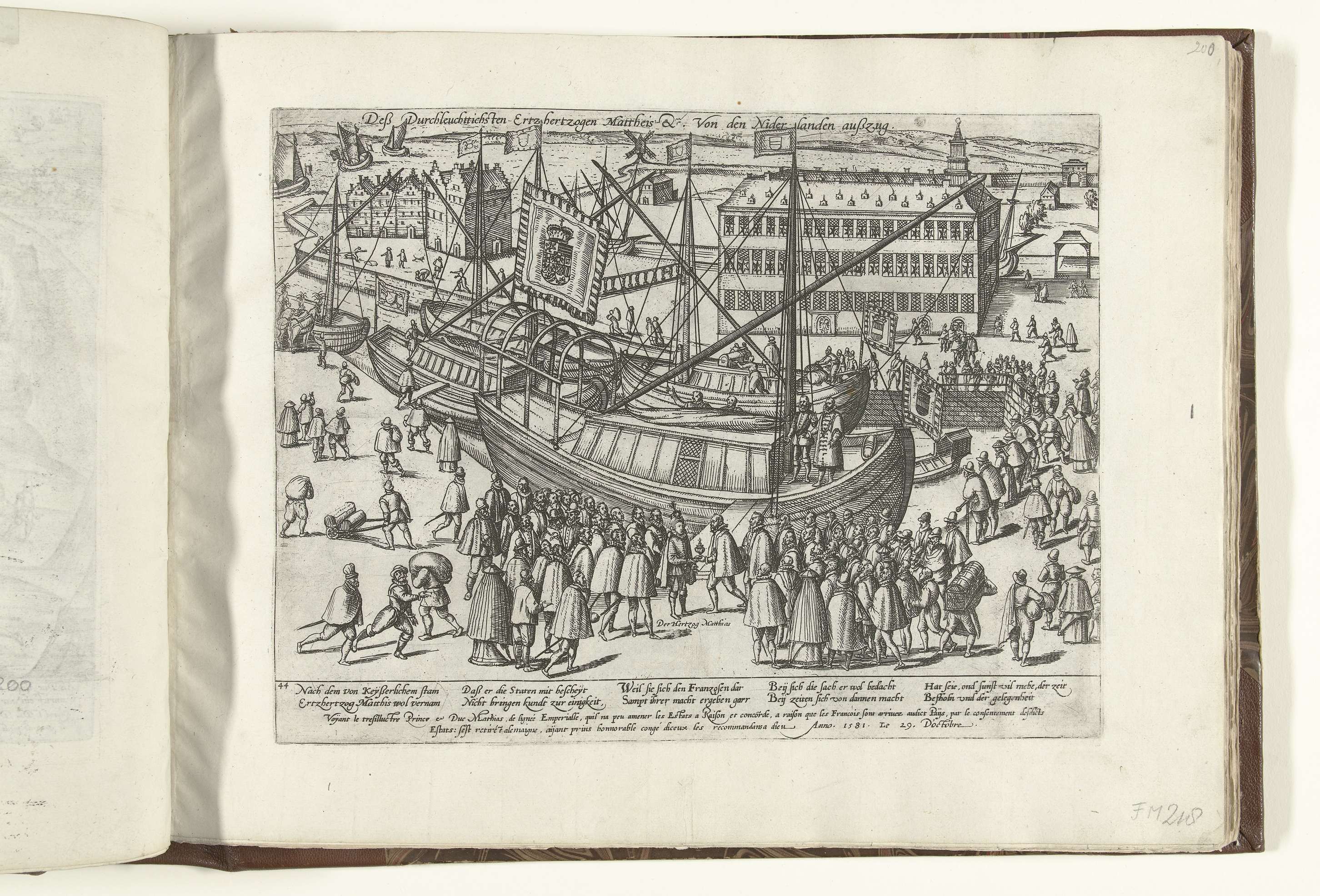 Het vertrek van aartshertog Matthias uit de Nederlanden, 29 oktober 1581. Matthias neemt afscheid op de kade van Antwerpen bij een gereed staand schip met vaandels. Met onderschrift van 10 regels in het Duits en 2 regels in het Frans. Genummerd: 44.