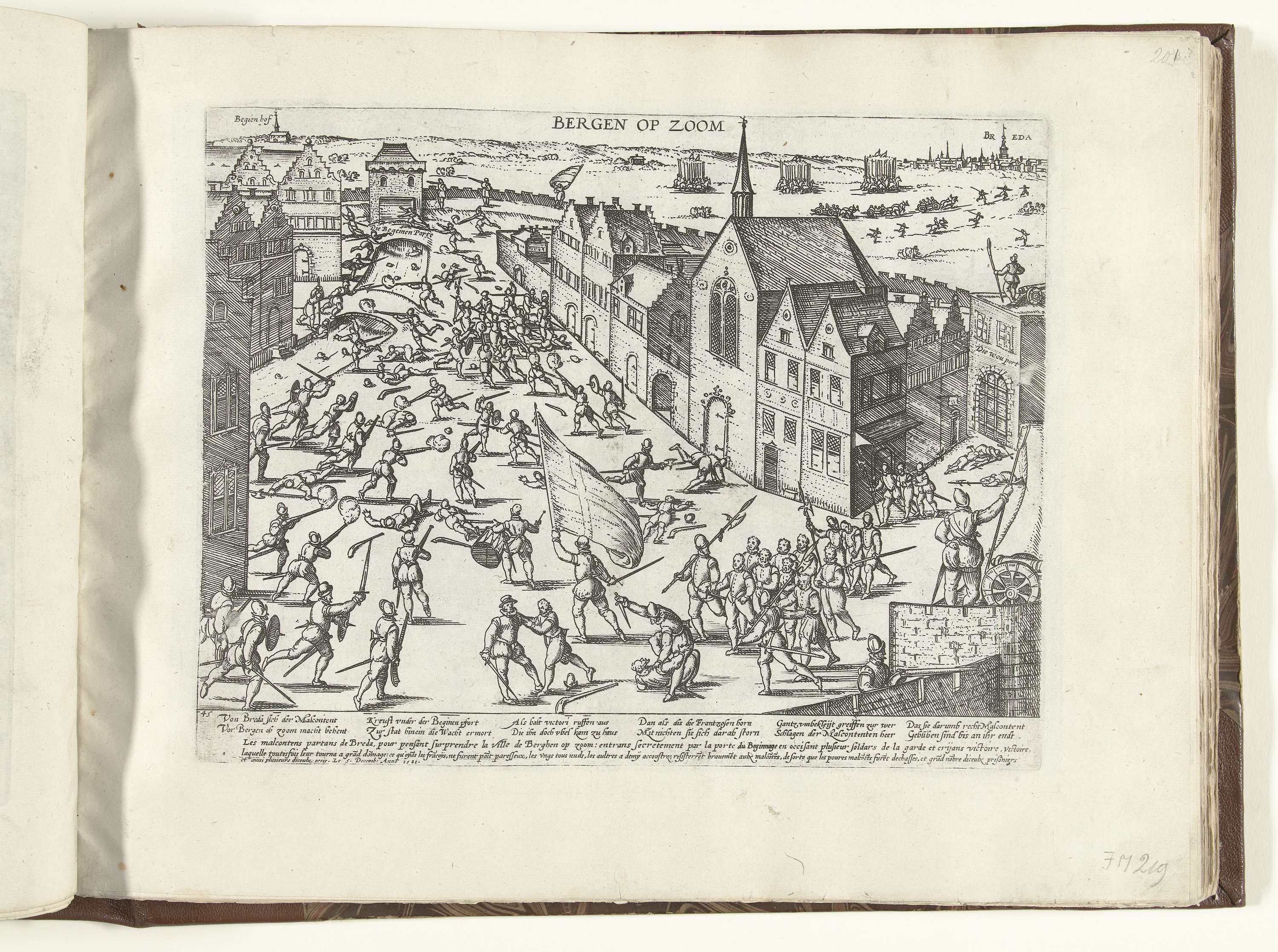 Aanslag op Bergen op Zoom verijdeld, 5 december 1581. De Waalse soldaten die via de Begijnenpoort de stad binnen waren gekomen in gevecht met het Franse garnizoen in de stad. Met onderschrift van 12 regels in het Duits en 3 regels in het Frans. Genummerd: 45.