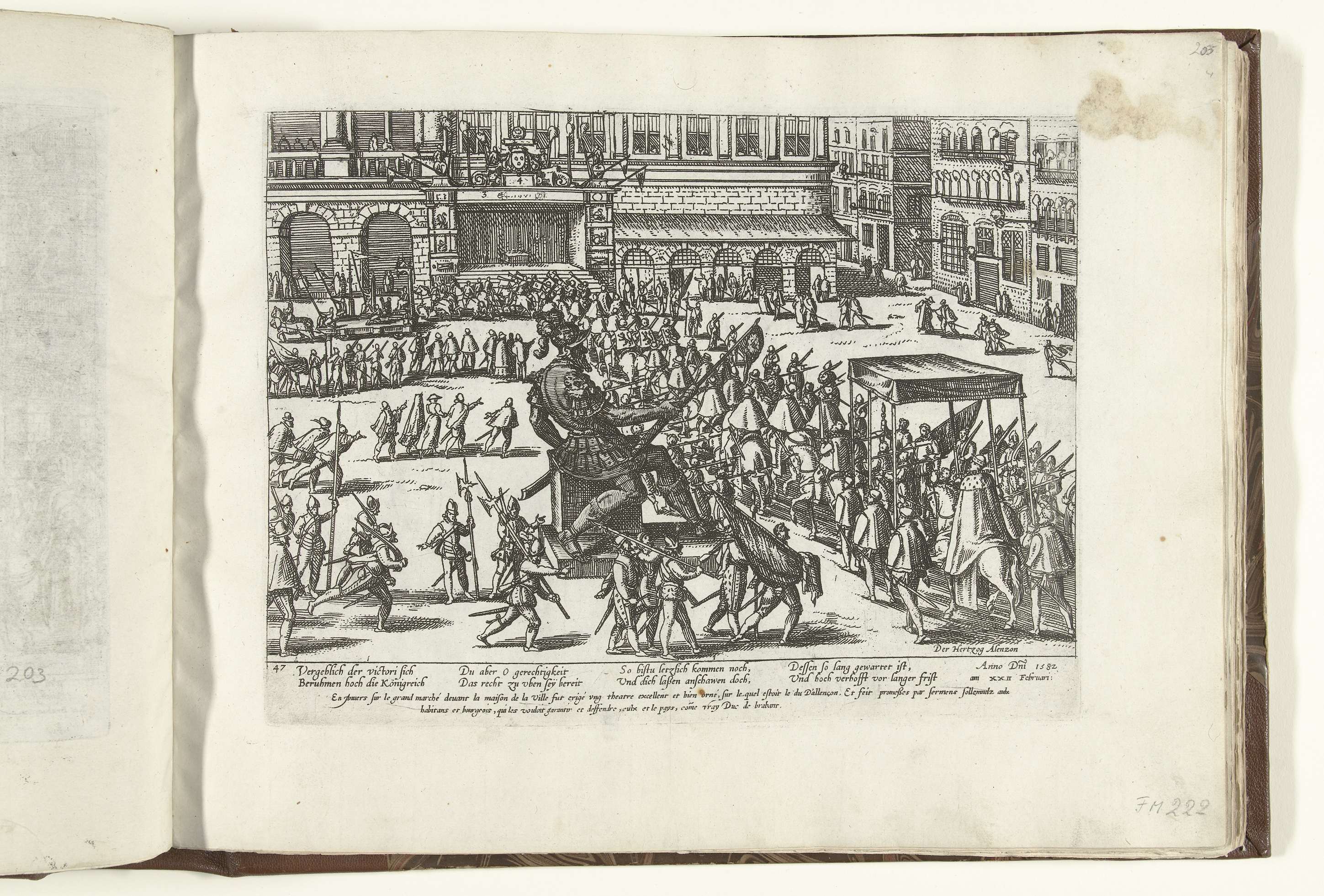 Feestelijke intocht van Anjou te Antwerpen, 22 februari 1582. De stoet met de hertog komt op de Grote Markt waar een beeld van de reus Druon opgesteld staat. Met onderschrift van 8 regels in het Duits en 2 regels in het Frans. Genummerd: 47.