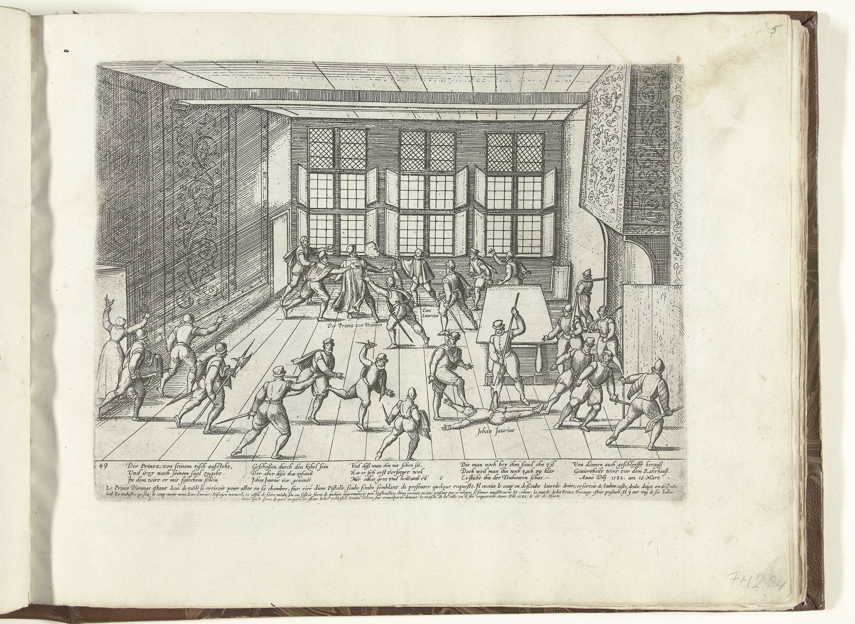 Moordaanslag door Jean de Jauregui op Willem van Oranje te Antwerpen, 18 maart 1582. In een interieur lost Jauegui een pistoolschot op de prins. Op de voorgrond wordt Jauregui door soldaten overmeesterd. Met onderschrift van 14 regels in het Duits en 3 regels in het Frans. Genummerd: 49.