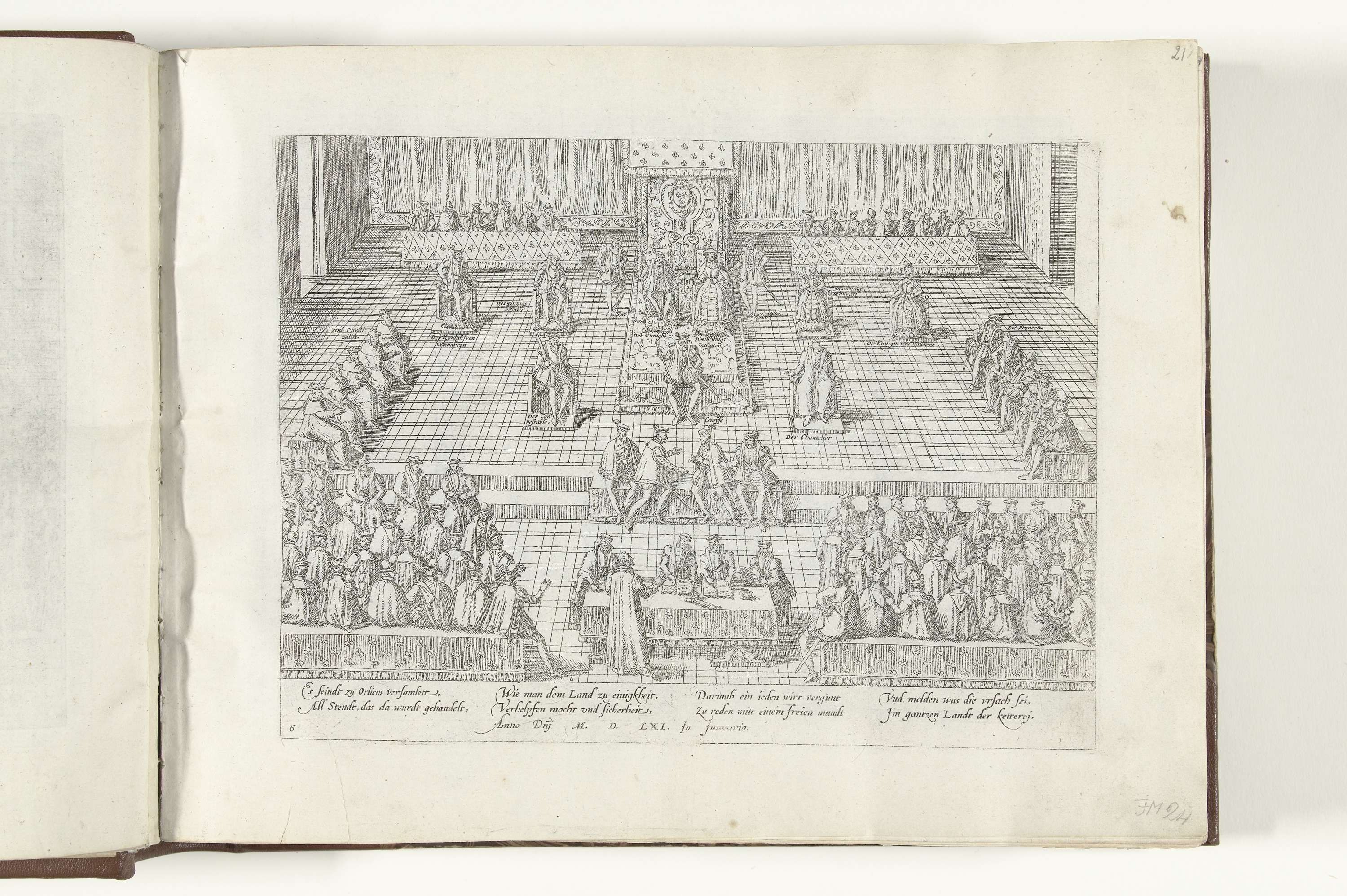 Vergadering van de drie standen te Orléans, januari 1561. In aanwezigheid van de koning, zijn moeder en de hertog van Guise. Met onderschrift van 8 regels in het Duits. Genummerd: 6.