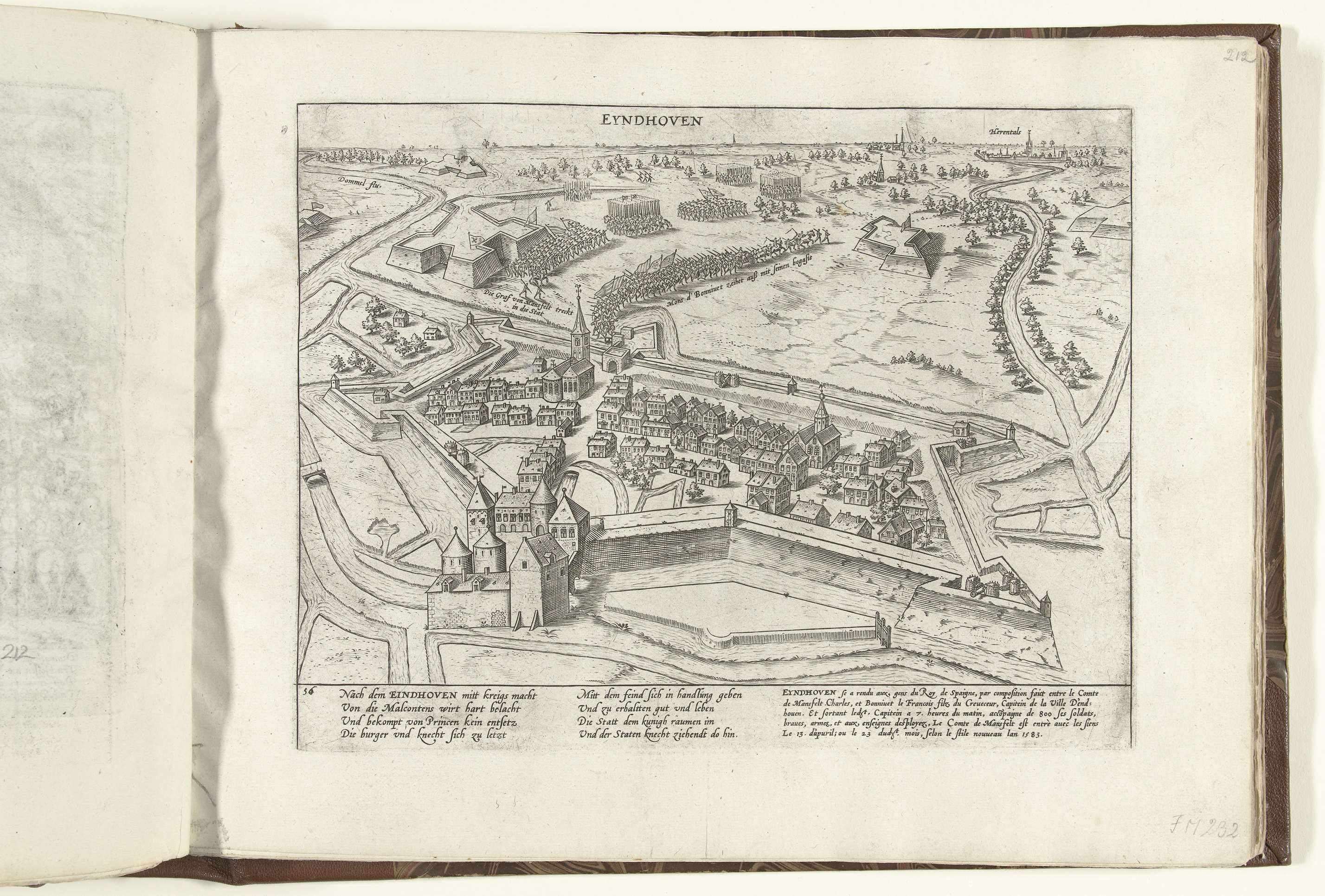 Eindhoven belegerd en ingenomen door de graaf van Mansveld, 23 april 1583. De troepen onder Bonnivet verlaten de stad en de troepen van Mansveld staan klaar om de stad in te trekken. Met onderschrift van 8 regels in het Duits en 5 regels in het Frans. Genummerd: 56.