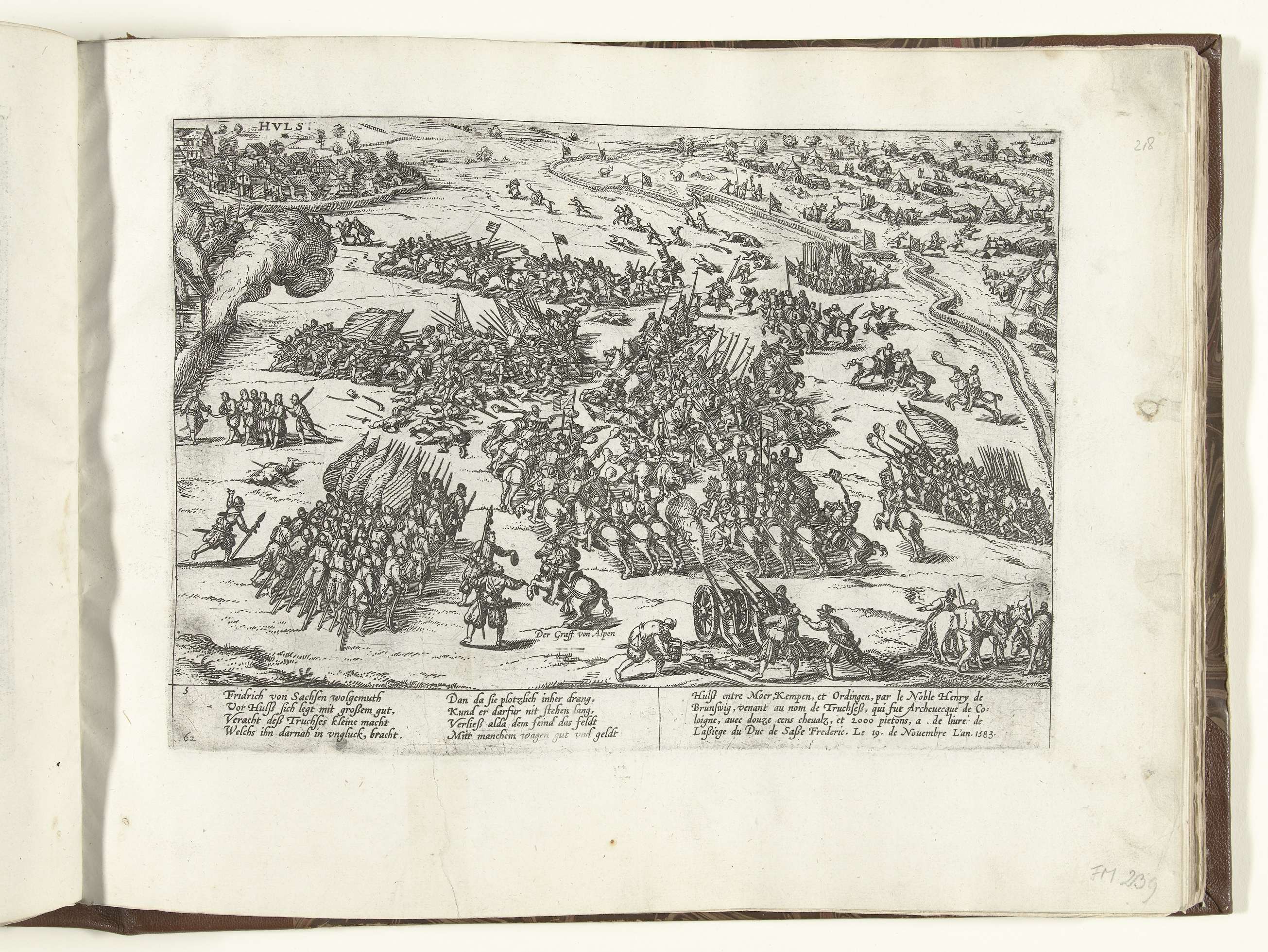 Beleg en ontzet van Hüls, 19 november 1583. Episode uit de Keulse Oorlog. Met onderschrift van 8 regels in het Duits en 4 regels in het Frans. Genummerd: 62 en 5.