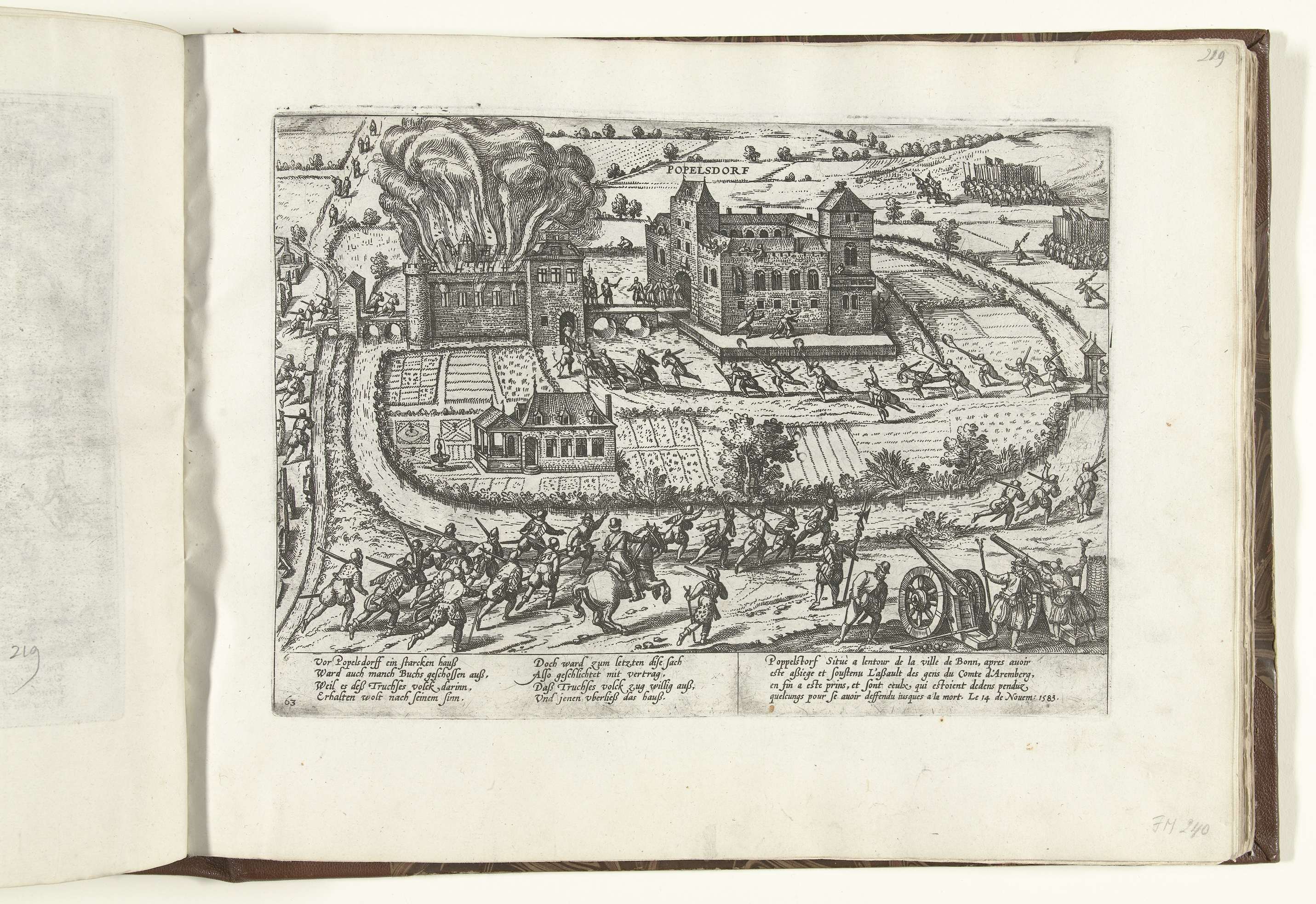 Inname van Schloß Poppelsdorf bij Bonn, 14 november 1583. Episode uit de Keulse Oorlog. Met onderschrift van 8 regels in het Duits en 4 regels in het Frans. Genummerd: 63 en 6.