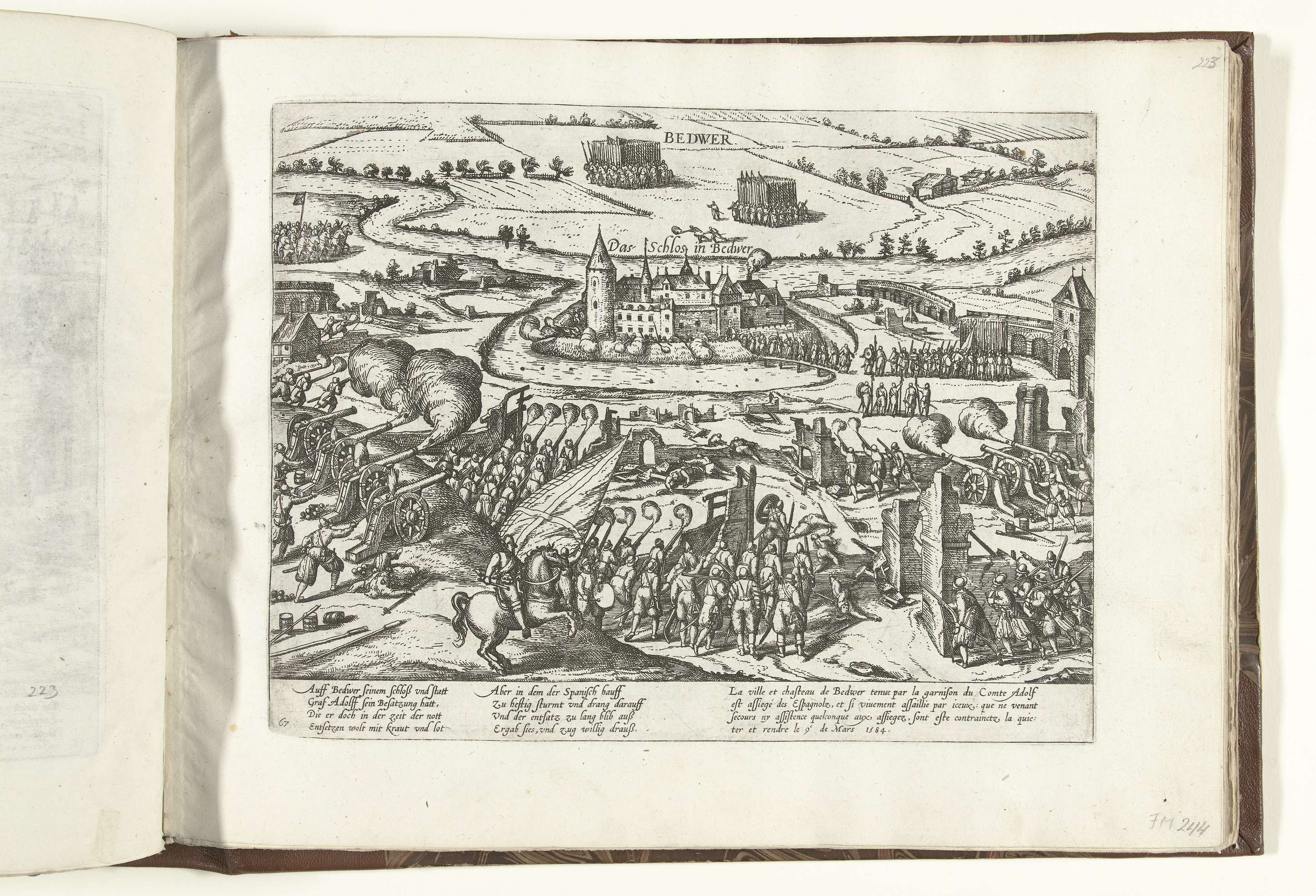 Beleg en overgave van Schloß Bedburg / Bedwer door graaf Adolf von Neuenahr, 9 maart 1584. Episode uit de Keulse Oorlog. Met onderschrift van 8 regels in het Duits en 4 regels in het Frans. Genummerd: 67.