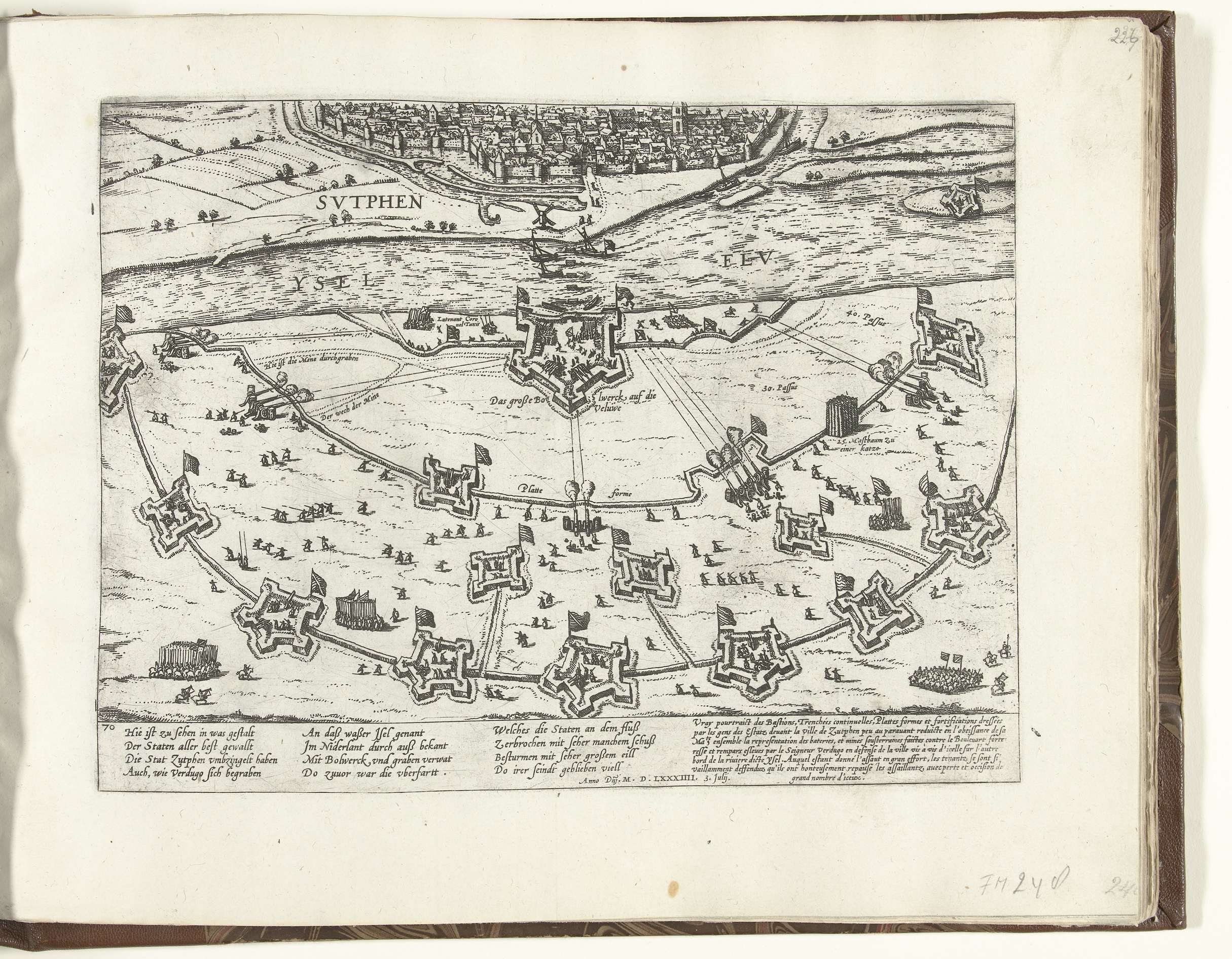 Overzicht van de stellingen van de belegerende troepen van graaf Hohenlohe bij Zutphen aan de overzijde van de IJssel, 3 juli 1584. Met onderschrift van 12 regels in het Duits en 7 regels in het Frans. Genummerd: 70.