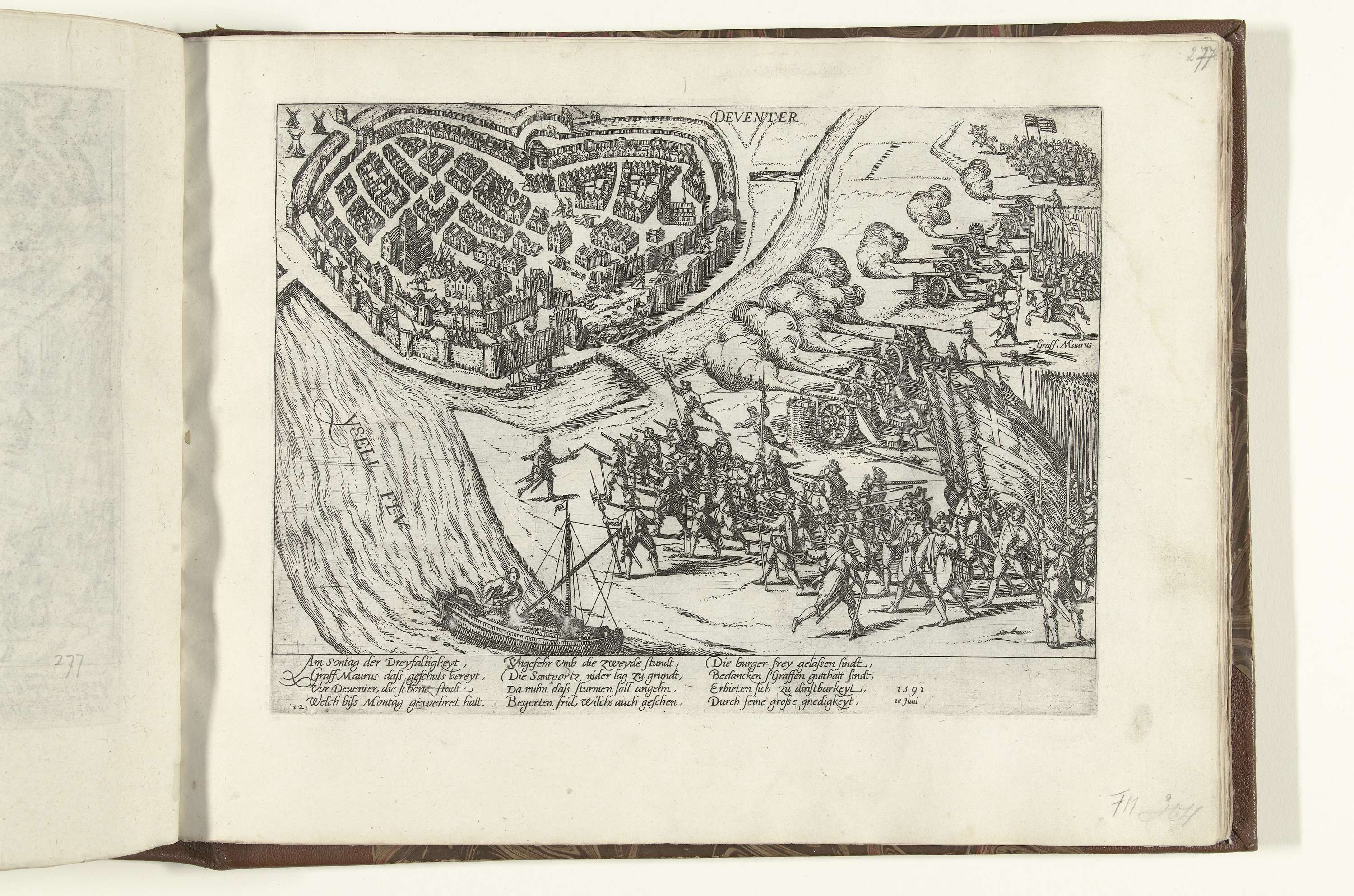 Inname van Deventer door prins Maurits, 10 juni 1591. Het Staatse leger schiet een bres in de muur van de stad. Met onderschrift van 12 regels in het Duits. Genummerd: 121.