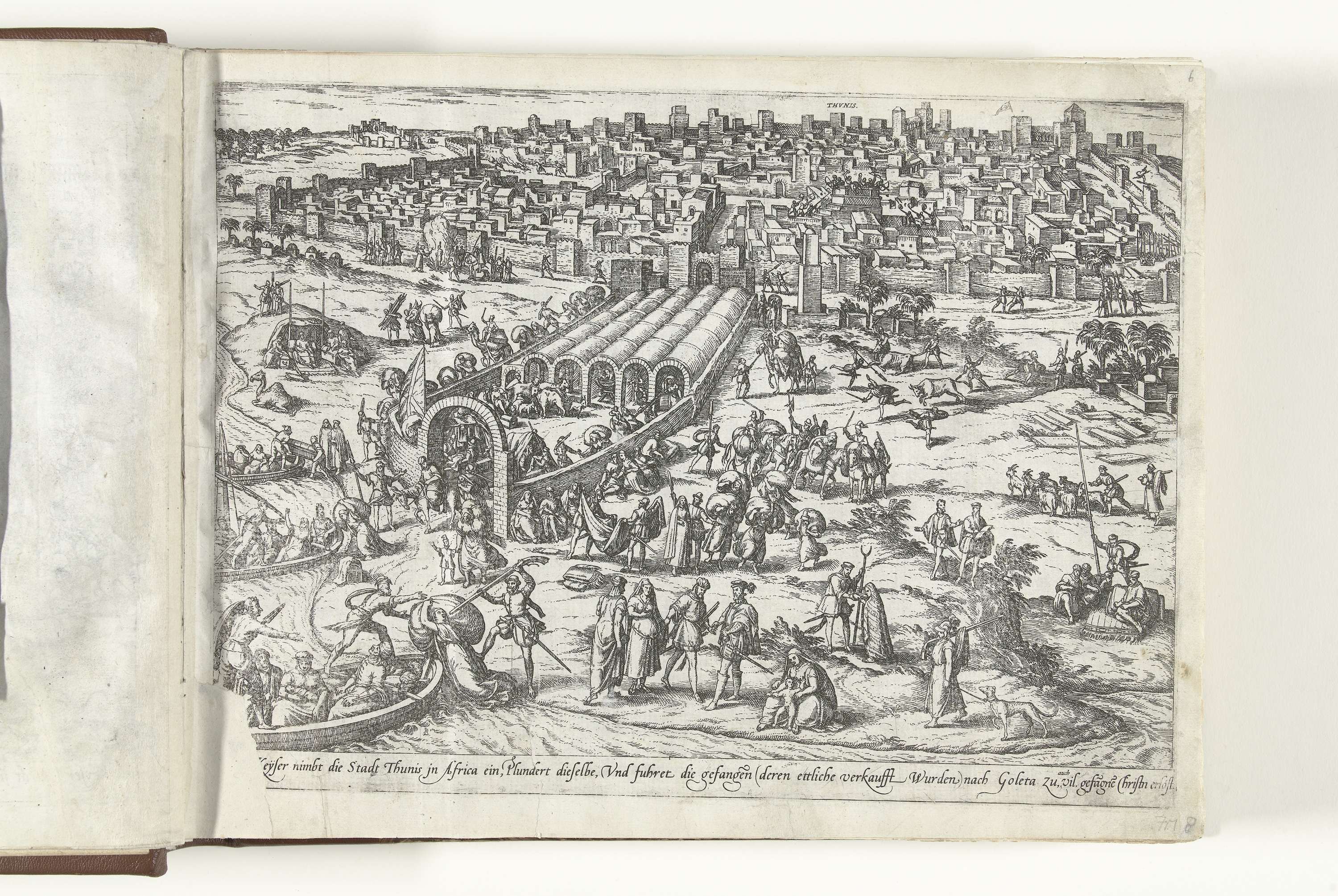 De keizerlijke troepen nemen Tunis in, 1535. Sommige bewoners ontvluchten de stad in kleine bootjes. Op de achtergrond de ommuurde stad. Hoek linksonder met nummer [6] ontbreekt.