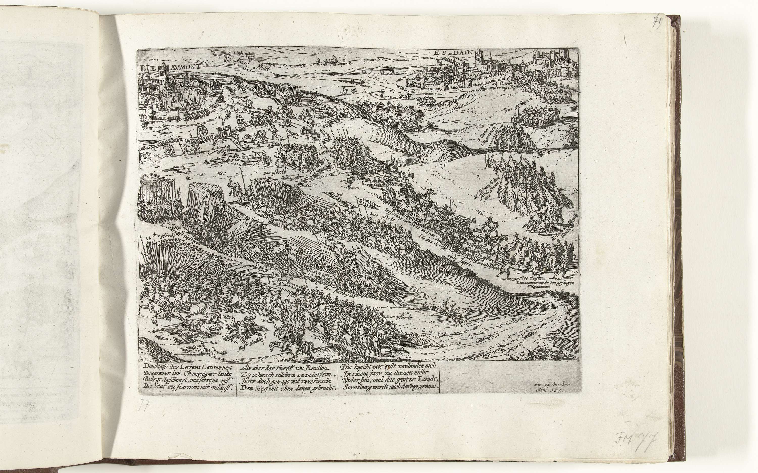 Overwinning van Bouillon op de legers van de hertog van Lotharingen bij Beaumont in Henegouwen, 14 oktober 1592. Met onderschrift van 12 regels in het Duits. Ongenummerd.