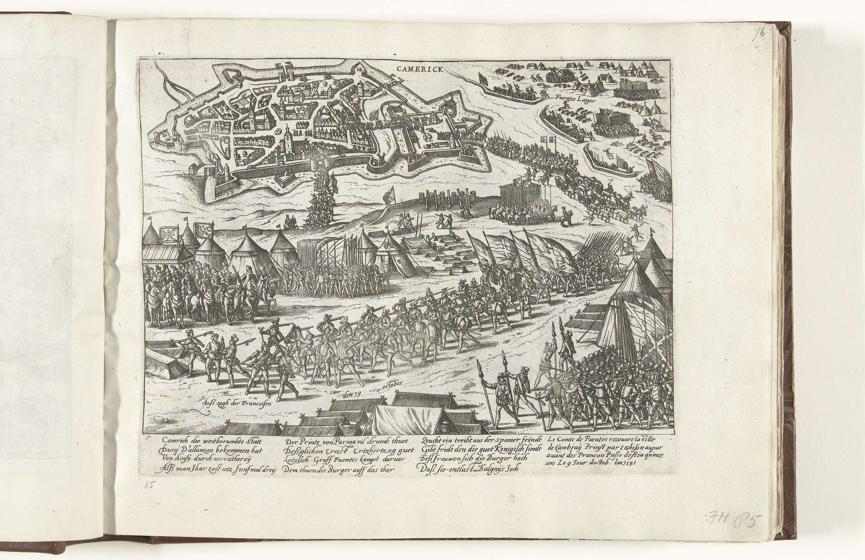 De Spaanse graaf van Fuentes verovert Kamerijk, 19 oktober 1595. De Franse soldaten verlaten Kamerijk. Met onderschrift van 12 regels in het Duits en 4 regels in het Frans. Ongenummerd.