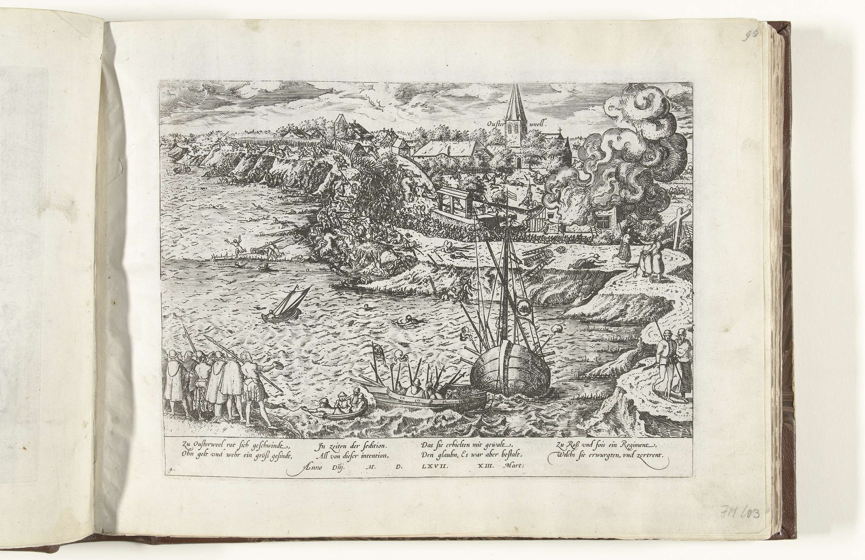 De slag bij Oosterweel, in de nacht van 13 op 14 maart 1567. Gevechten rond de dijk bij de waterkant, rechts een brandend gebouw. De calvinisten onder leiding van Jan van Marnix worden verslagen door de troepen van de hertog van Aremberg en Philips van Lanoy. Met onderschrift van 8 regels in het Duits. Genummerd: ...