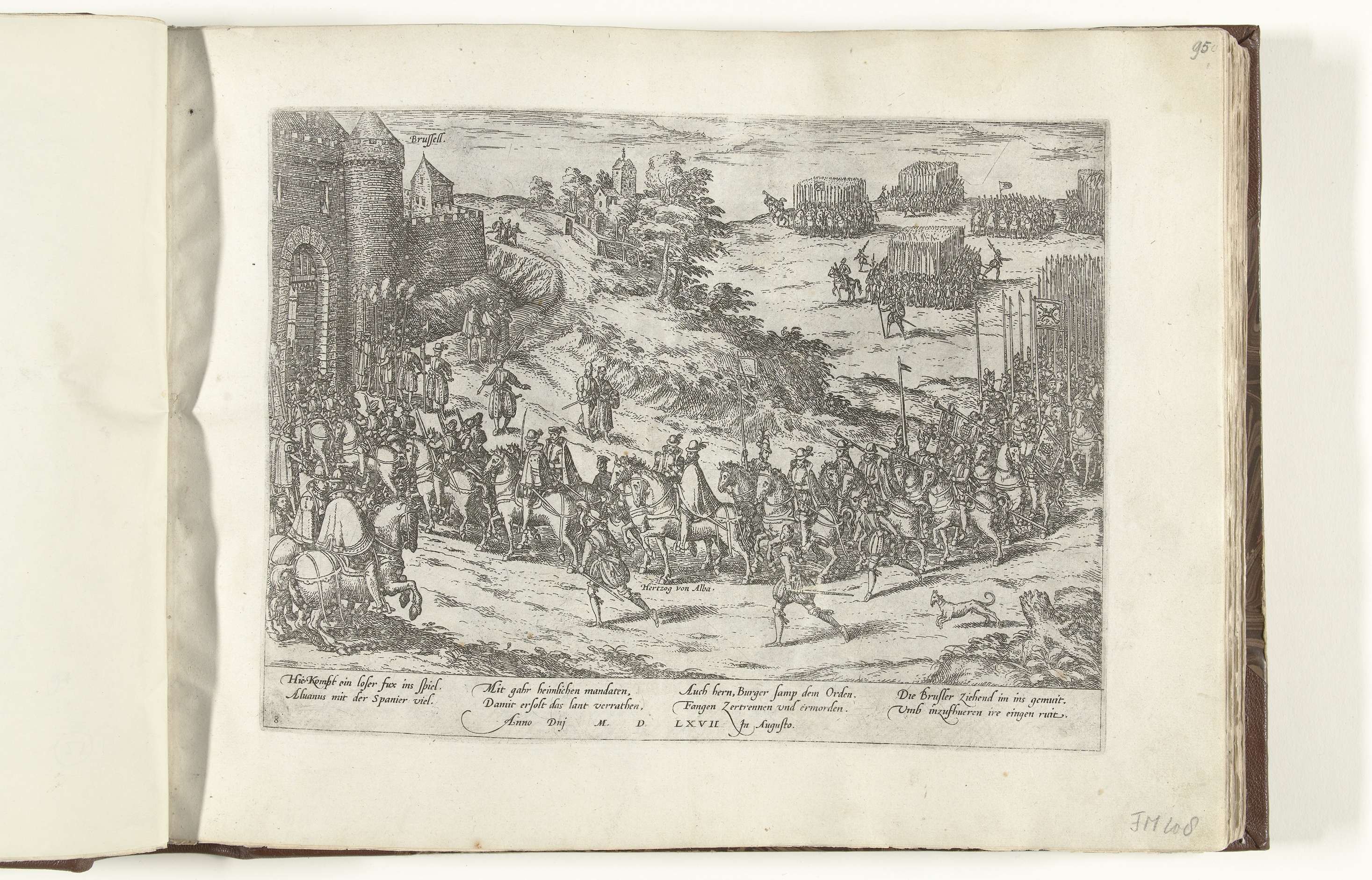 Aankomst van de hertog van Alva te Brussel, 22 augustus 1567. Alva te paard arriveert met zijn leger bij de poort van de stad. Met onderschrift van 8 regels in het Duits. Genummerd: 8.