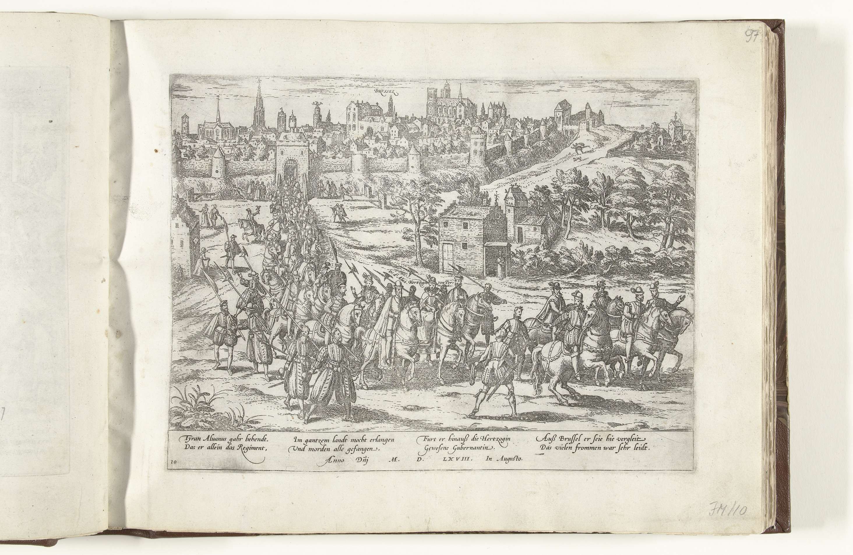 Margaretha van Parma door Alva Brussel uitgeleid, 30 augustus 1568. Stoet met Alva en de landvoogdes verlaat de stad, op de achtergrond de ommuurde stad. Met onderschrift van 8 regels in het Duits. Genummerd: 10.