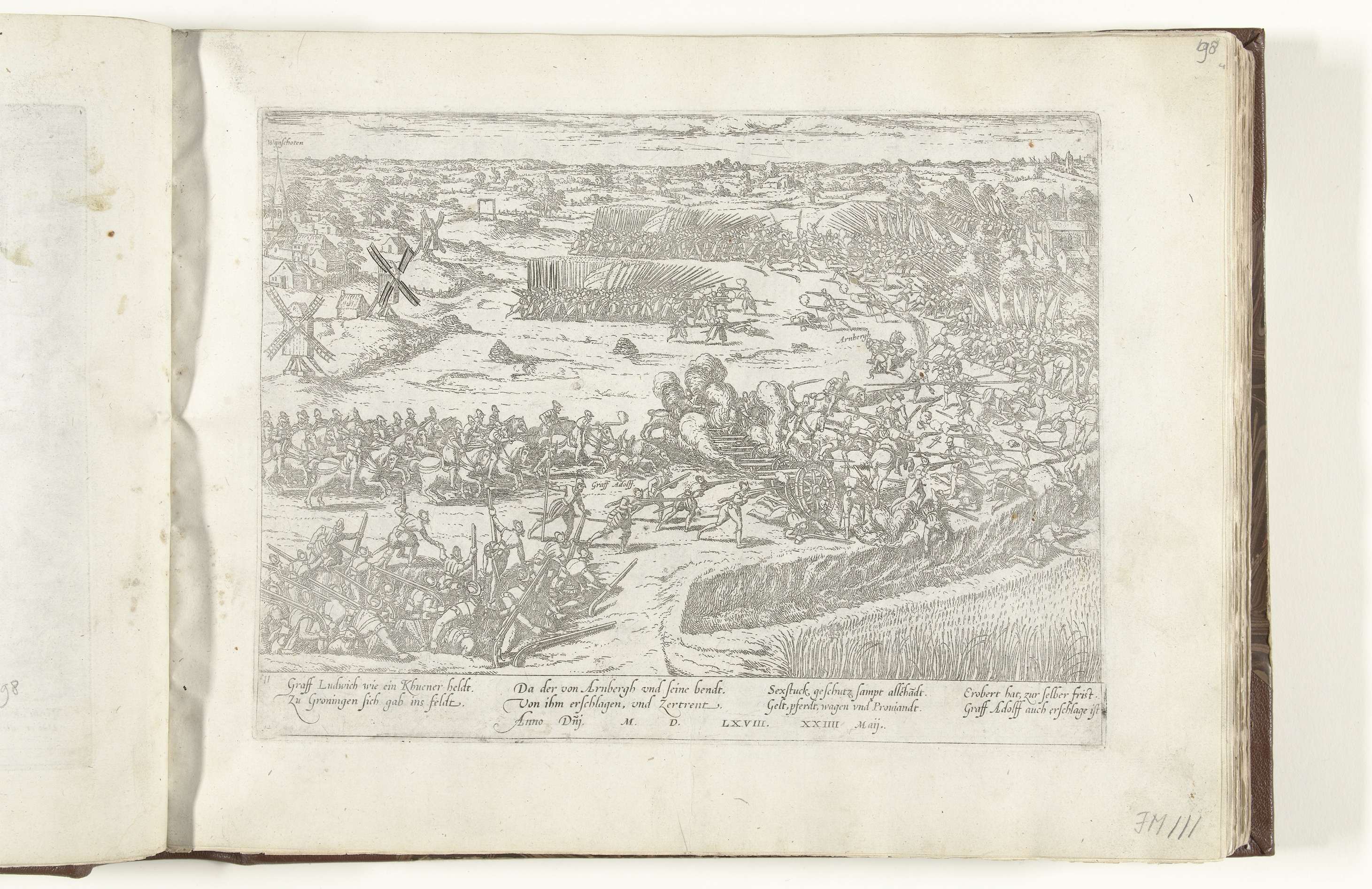Slag bij Heiligerlee, 23 mei 1568. Gezicht op het slagveld, in het midden sneuvelt graaf Adolf, rechts de graaf van Arenberg. Met onderschrift van 8 regels in het Duits. Genummerd: 11.