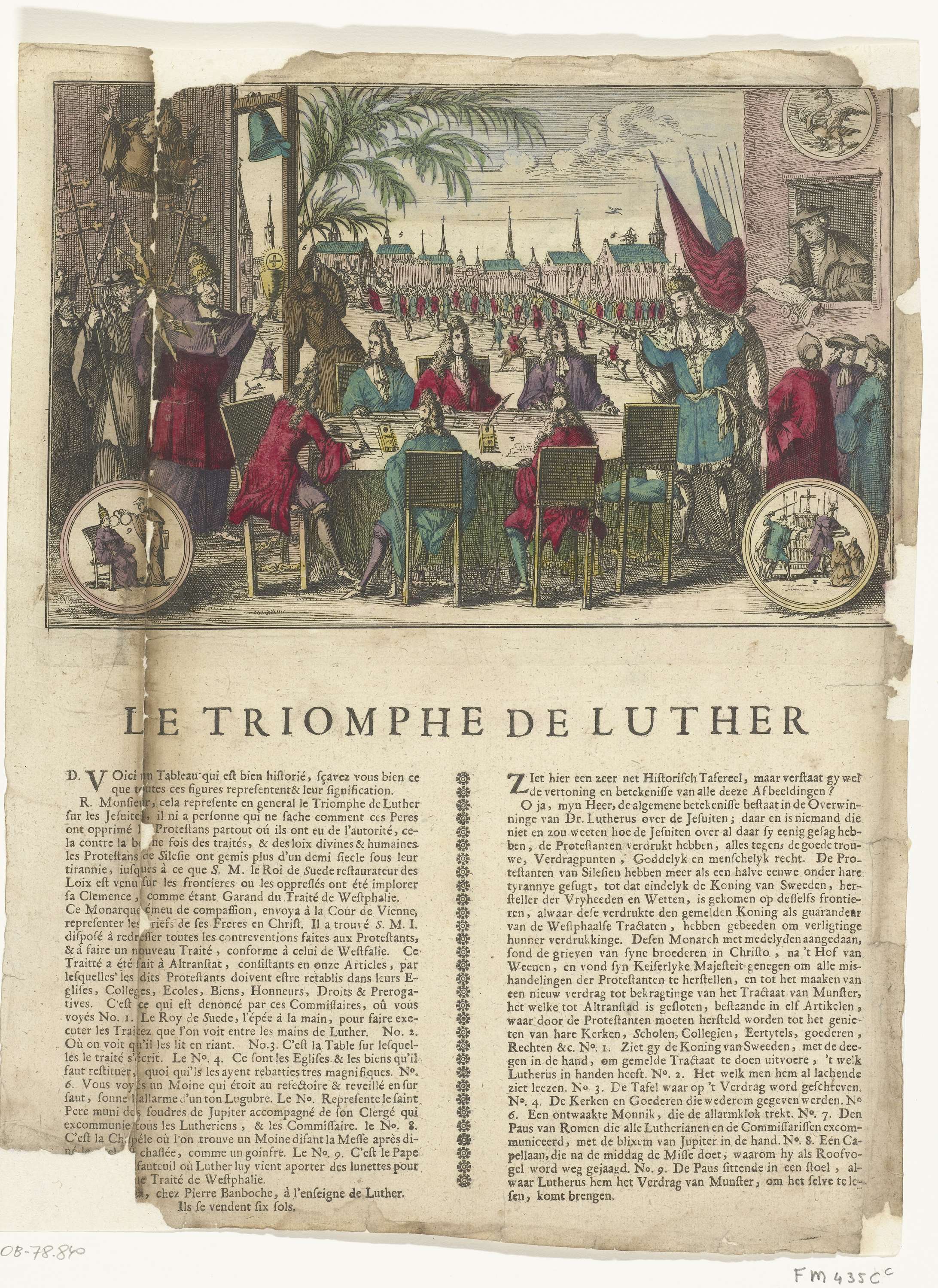 Triomf van Luther, ca. 1707. Koning Karel XII van Zweden komt op voor het herstel van de rechten van de lutheranen volgens het verdrag van Altranstädt, 1707. De koning staat aan het hoofd van een tafel waaraan het verdrag getekend wordt en wijst met zijn zwaard naar een razende paus aan de linker kant van ...
