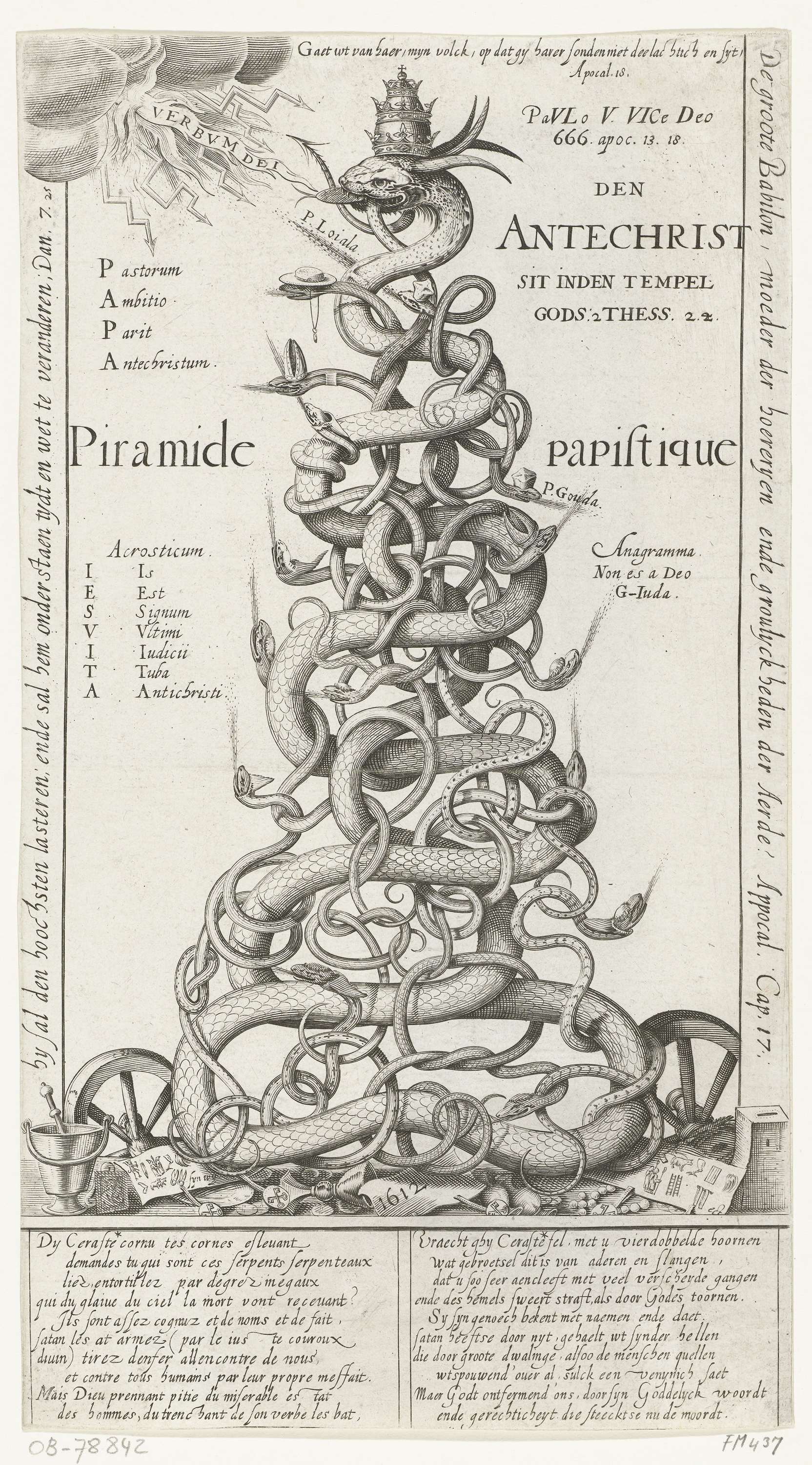 Paapse piramide, 1612. Piramide gevormd door een grote slang voorstellende het pausdom en vele kleine slangetjes die andere elementen van de katholieke kerk symboliseren. Twee kleine slangen worden aangeduid als Loyola en pater Johannes de Gouda. Linksboven het Woord Gods uit een donderwolk. Op de grond allerlei gebruiksobjecten uit de roomse kerk. Met opschriften in ...