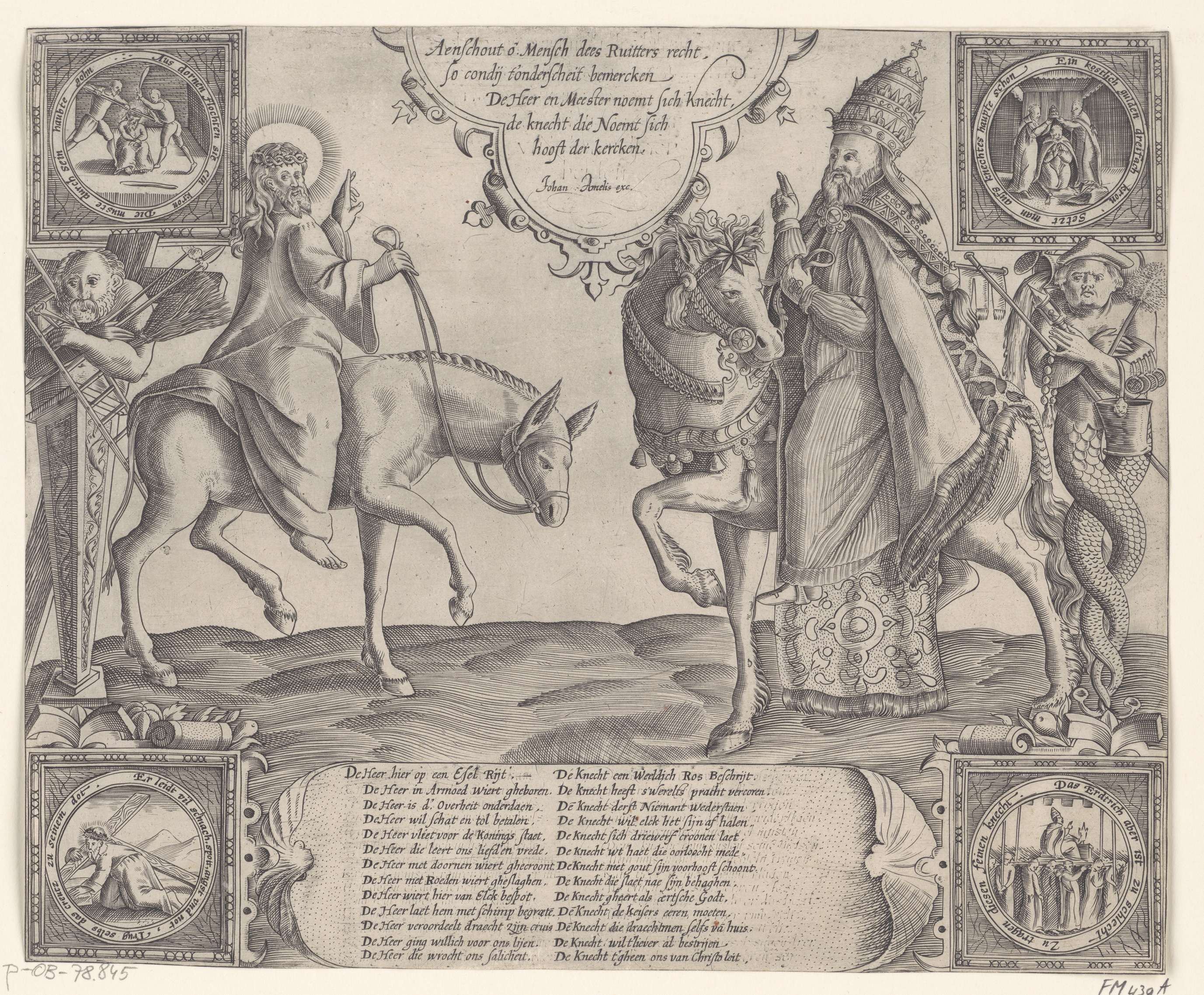 Christus op de ezel, de paus te paard. Vergelijking tussen de nederigheid van Christus en de hoogmoed van de paus. Links een herm met de passiewerktuigen en twee kleine scènes uit het lijden van Christus, rechts een herm met objecten uit de roomse mis en twee scènes waarin de paus gekroond en gedragen wordt. Met ...